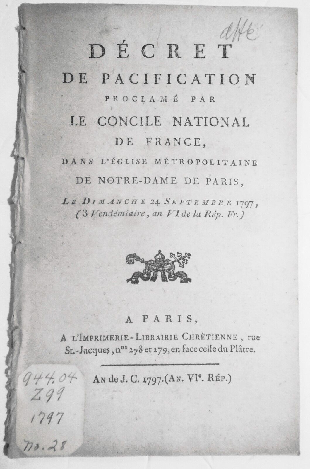 [French Revolution] Décret de pacification proclamé par le Concile national de France, dans l'Église métropolitaine de Notre-Dame de Paris, le dimanche 24 septembre 1797, (3 Vendémiaire, an VI de la Rép. Fr.).
