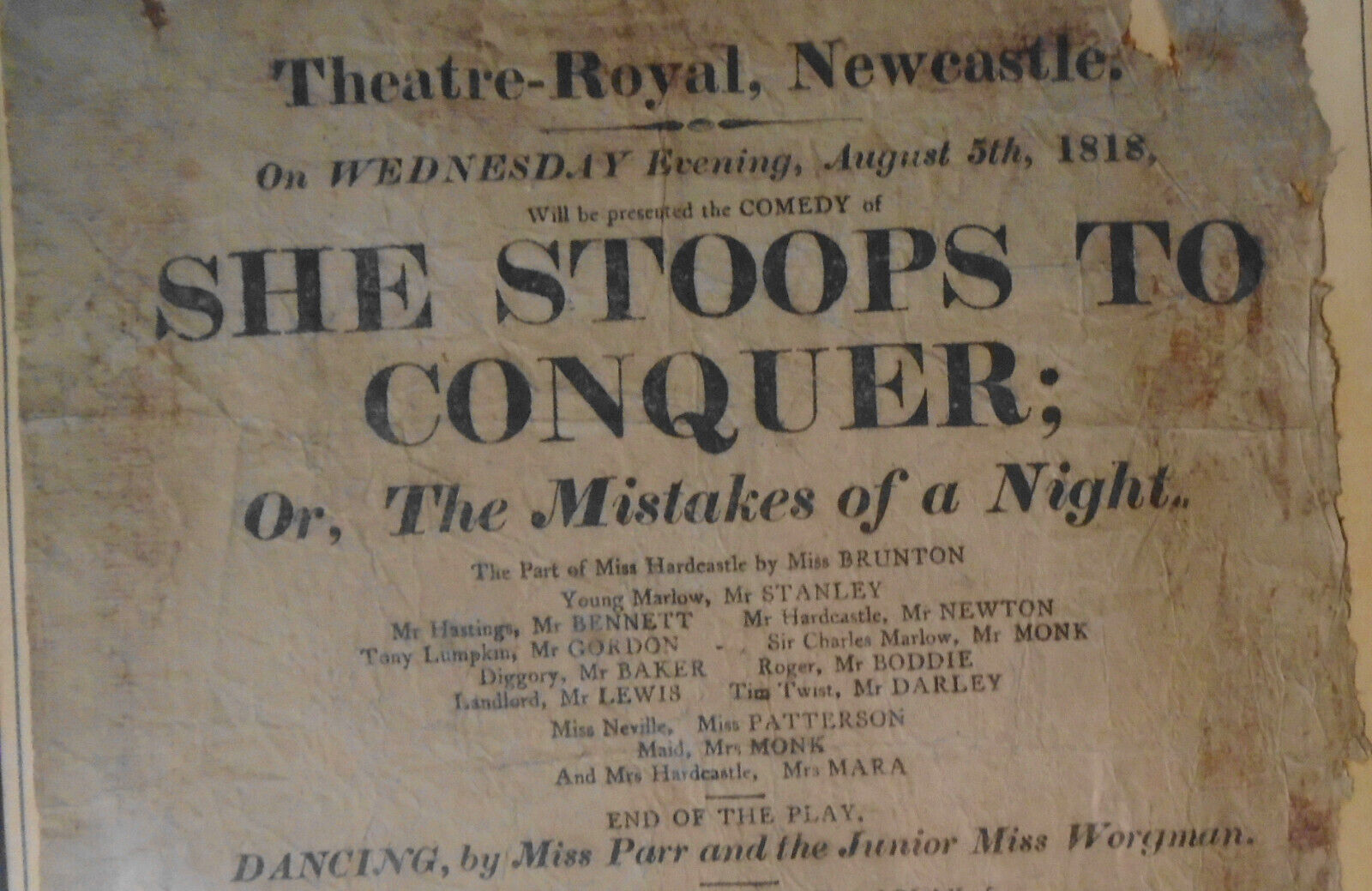 Original Playbill /broadside for She Stoops To Conquer by Oliver Goldsmith, and The Slave by Thomas Merton, at Theatre Royal, Covent Garden, 1818