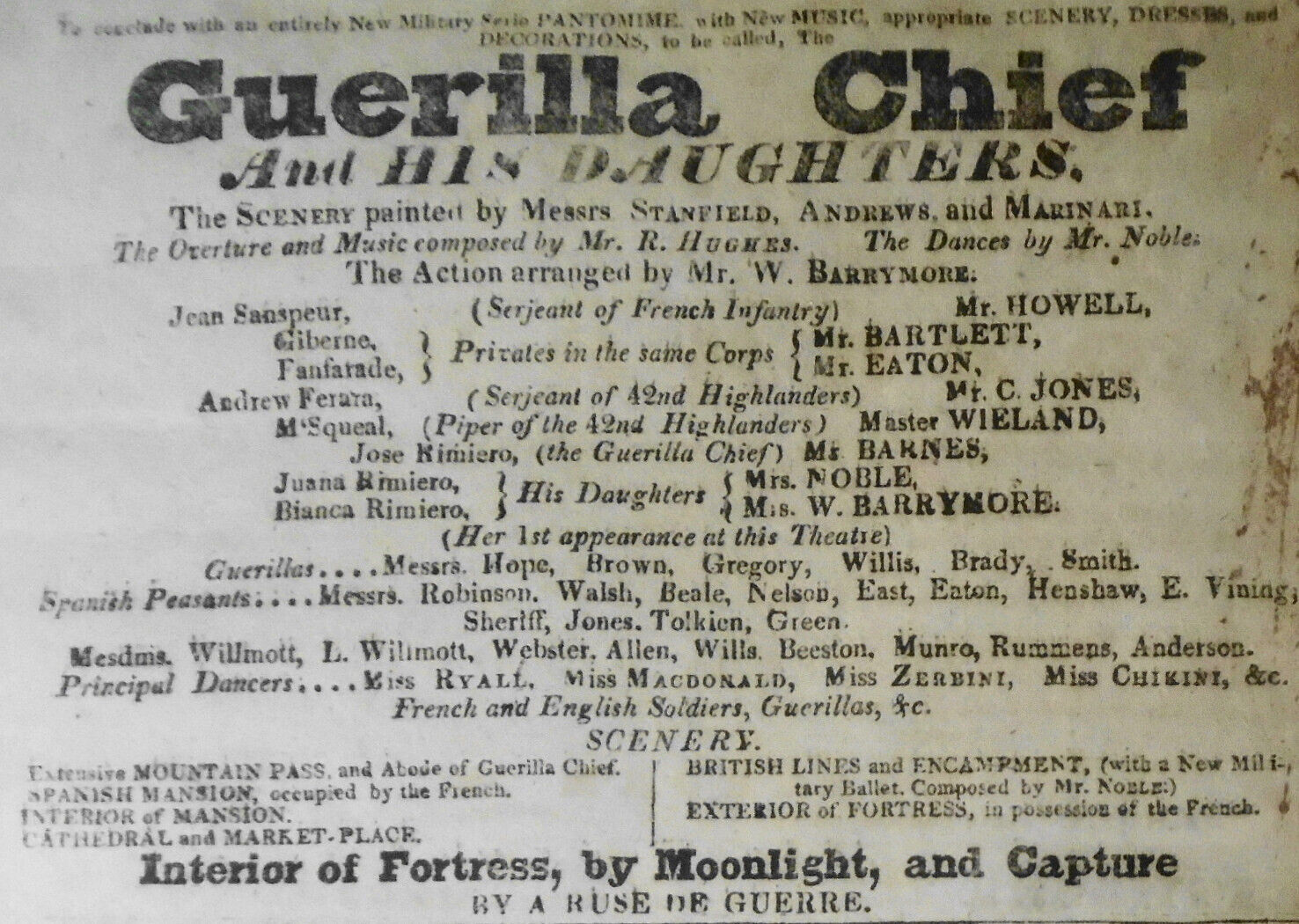 Original Playbill /broadside for Virginius by James Sheridan Knowles, plus The Guerilla Chief and his Daughters, "the action arranged by W. Barrymore" at Theatre Royal, Drury Lane, 1827. The name Barrymore was the stage name chosen by the patriarch of that