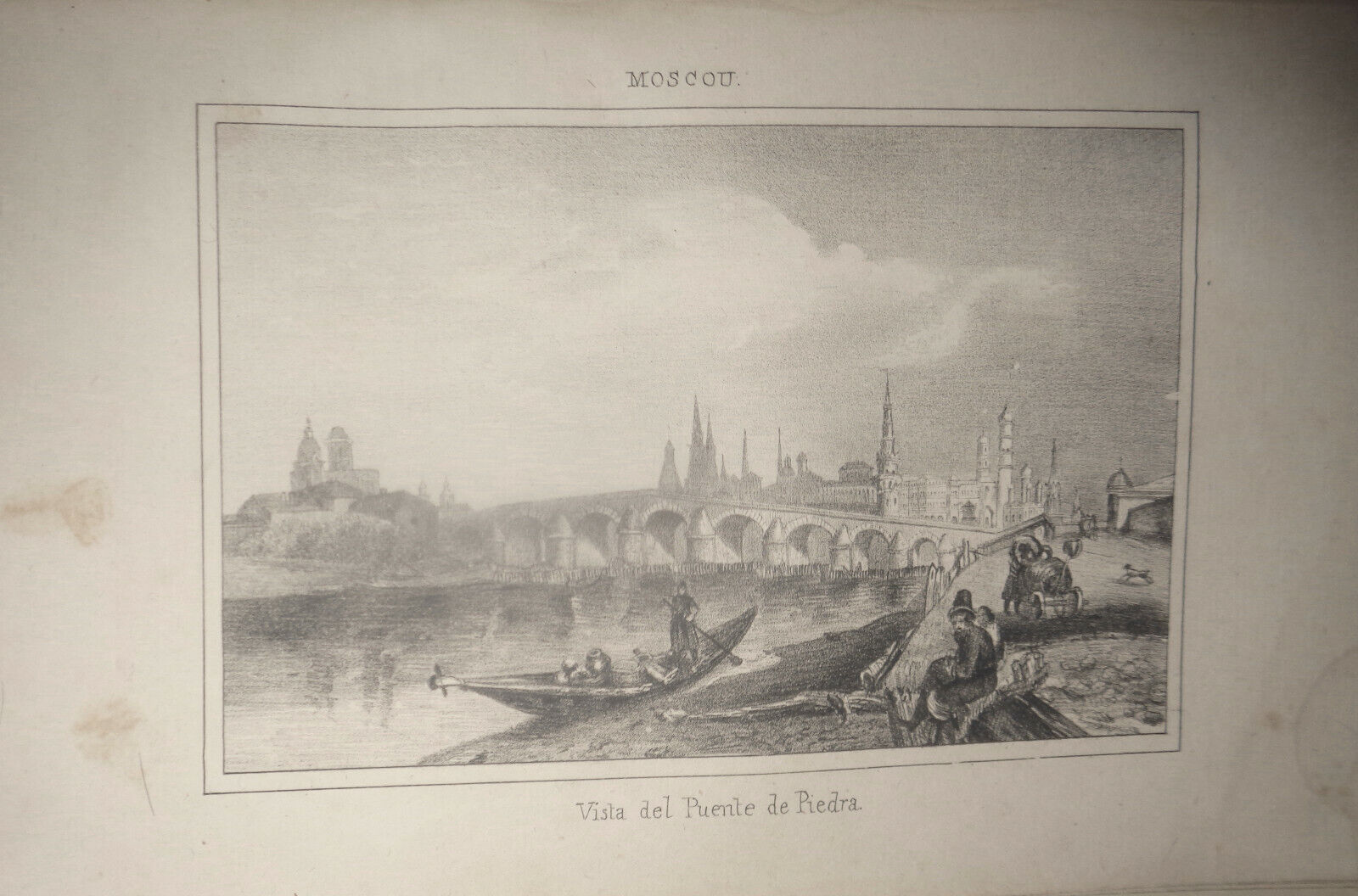 1840 Moscow : Vista del Puente de Piedra - original engraving. Chopin : Rusia