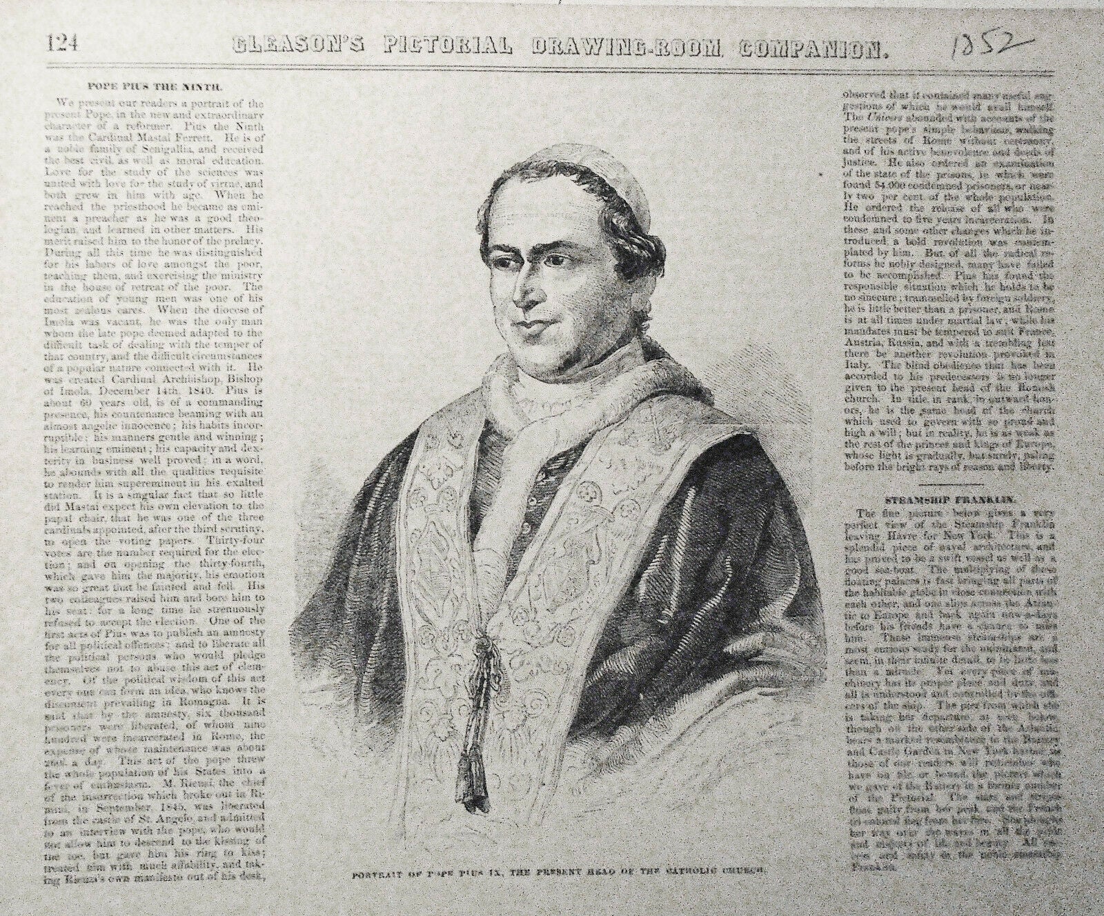 Pope Pius IX & Steamship Franklin leaving Hayre... 2 prints & story - original page from Gleason's Pictorial 1852
