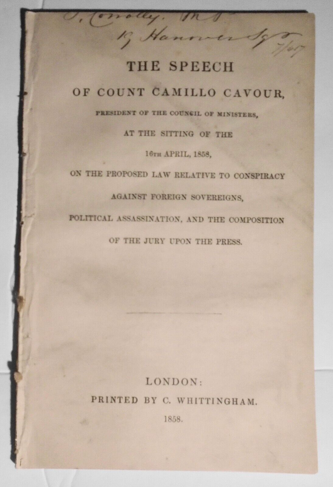 The speech of Count Camillo Cavour, President of the Council of Ministers : at the sitting of the 16th April, 1858, on the proposed law relative to conspiracy against foreign sovereigns, political assassination, and the composition of the jury upon the press.