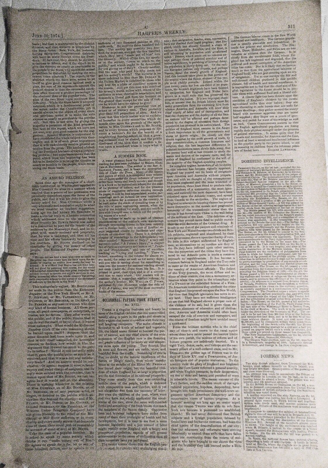 Original antique engravings from Harper's Weekly, June 20, 1874. Two prints on page, drawn by W. M. Cary: