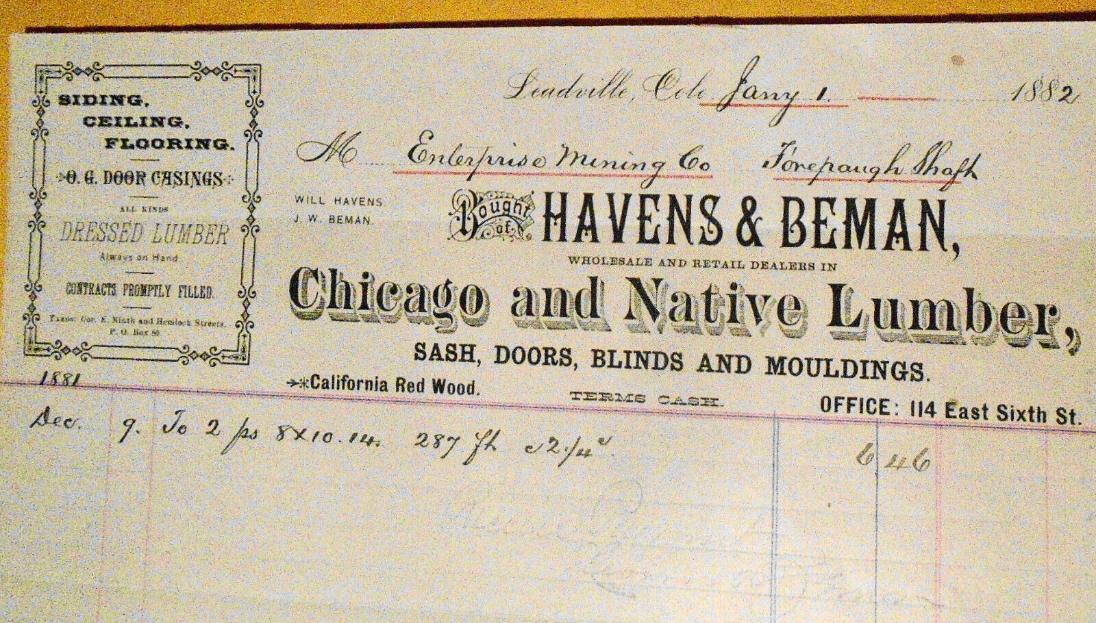 1882 Havens & Beman - Chicago and Native Lumber receipt - Leadville Colorado