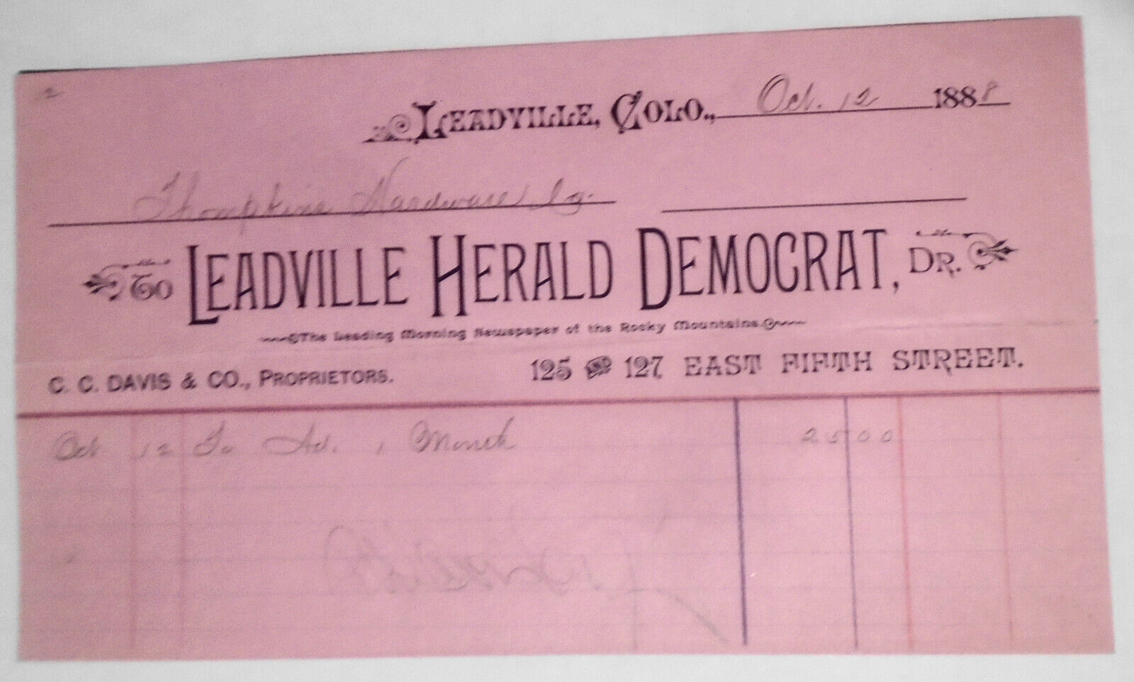 1888 original Billhead receipt, from Leadville Herald Democrat, Colorado