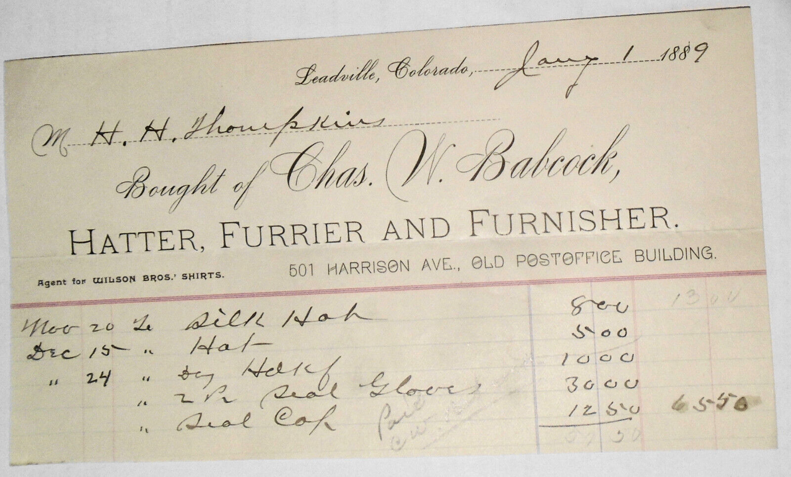 Original 1889 Billhead receipt from Chas. W. Babcock, Hatter, Furrier, and Furnisher, Leadville Colorado