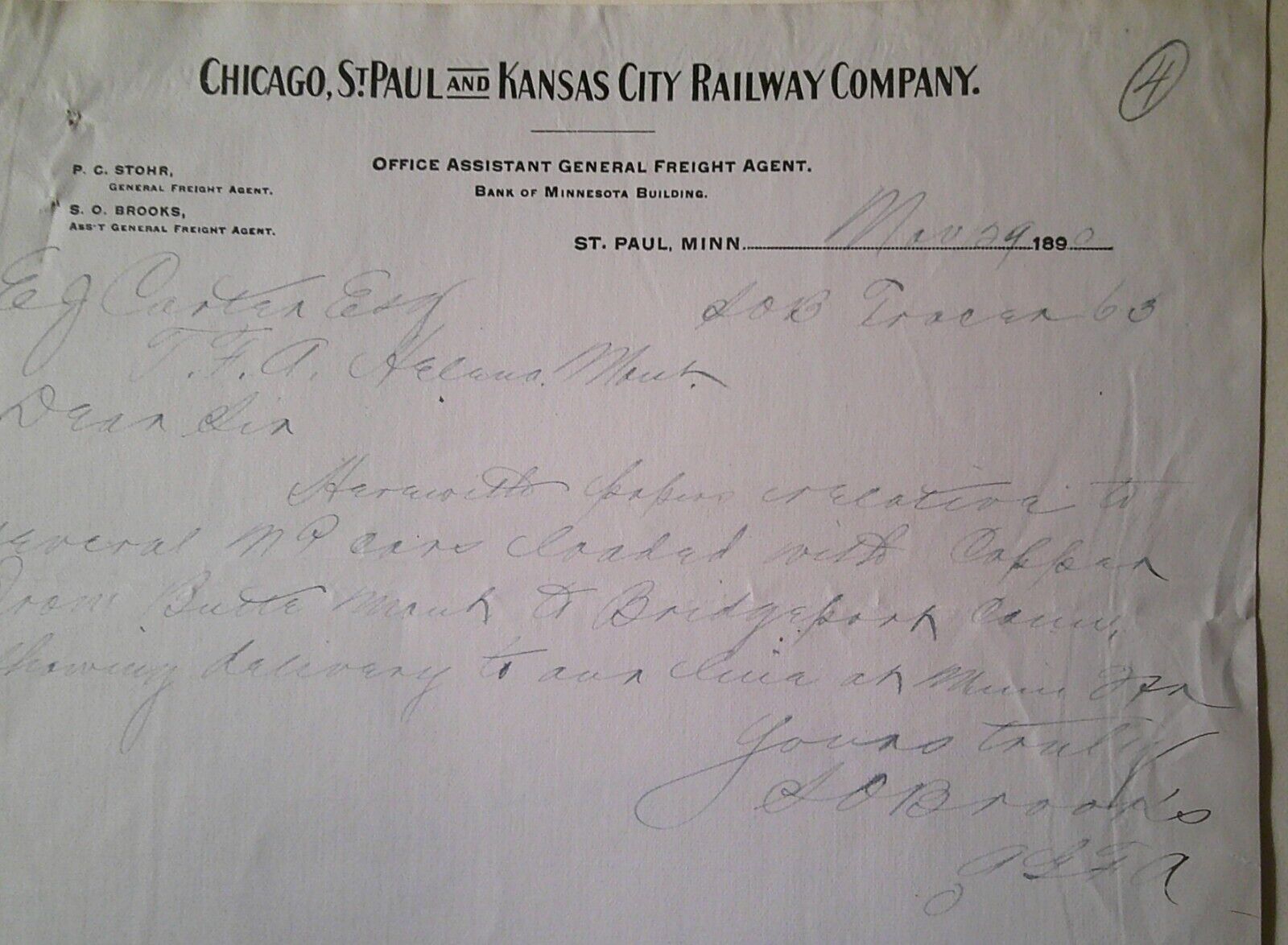 Original 1890 Chicago, St. Paul & Kansas Railway Company note on letterhead