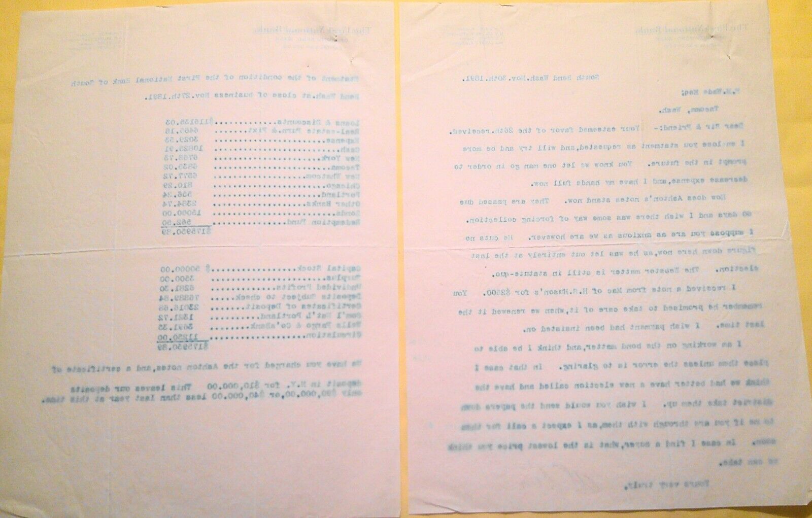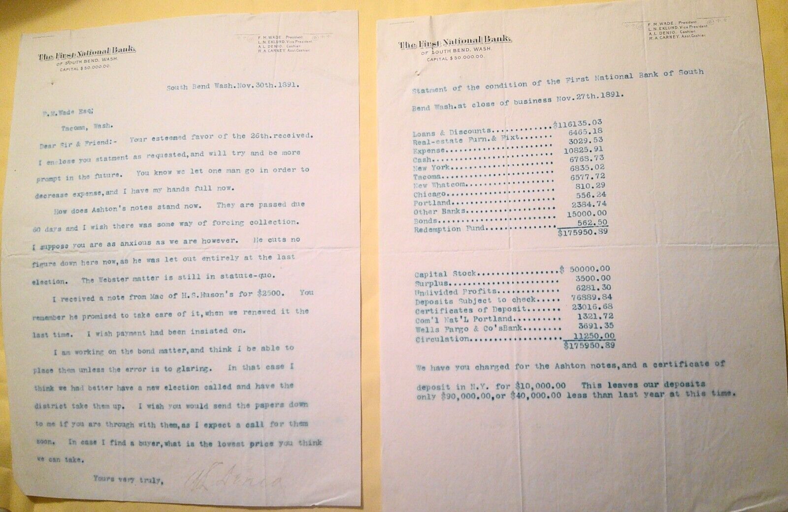 1891 Statement of Condition of First National Bank, of South West, Washington, with accompanying letter.