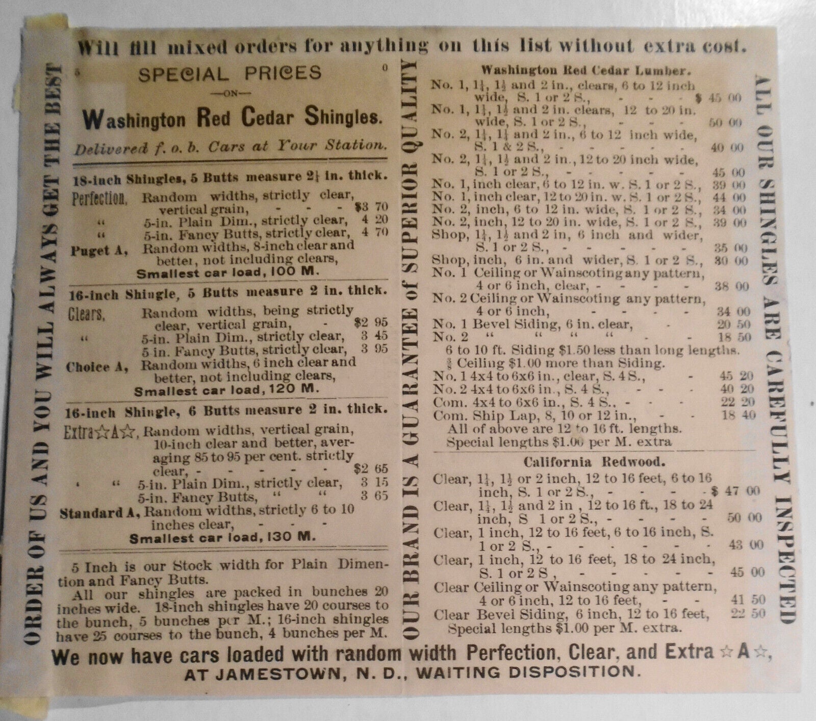 1892 Foster & Hastings, of Tacoma, Washington - Price List for Wholesale Red Cedar Shingles & Lumber