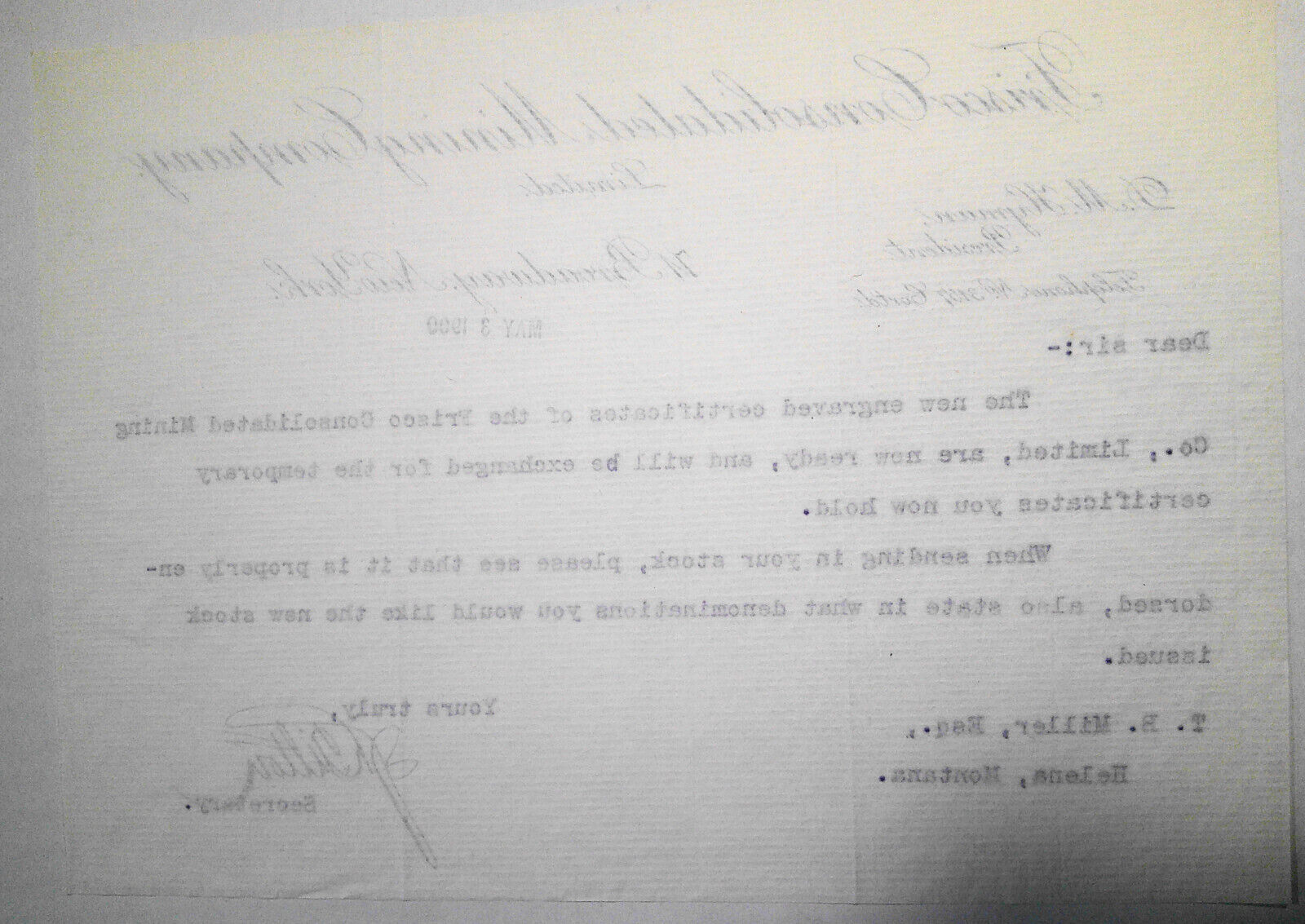Original 1900 Frisco Consolidated Mining Company, New York letter - re. stock certificates