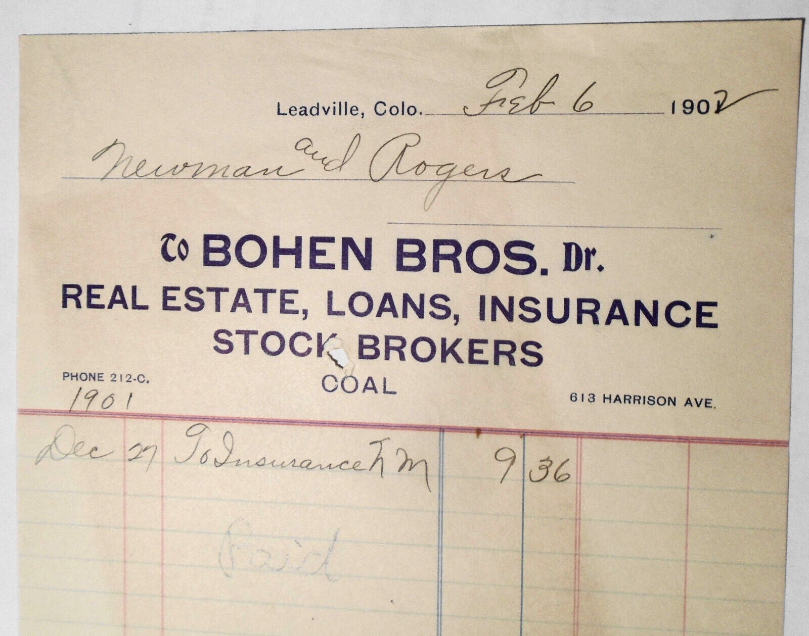Original 1902 billhead receipt for Newman and Rogers from Bohen Bros. Real Estate, Loans, Insurance, Stock Brokers .. Leadville, Colorado.
