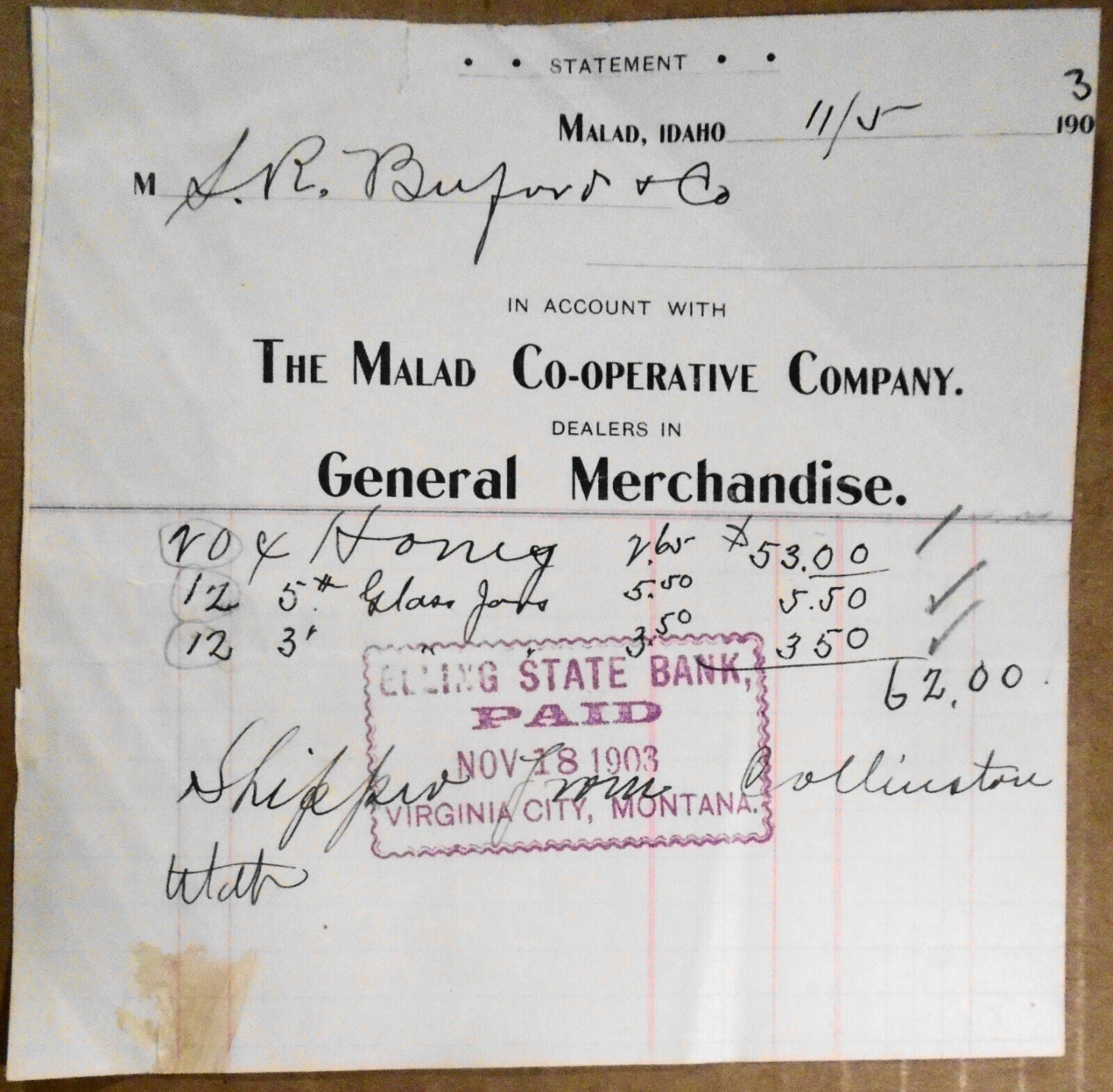 Original 1903 Statement of S. R. Buford & Co., in account with The Malad Co-operative Co., Dealers in General Merchandise, Malad, Idaho.