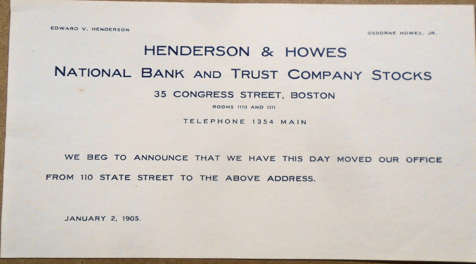 Original 1905 Henderson & Howes, National Bank and Trust Company Stocks - Notice of relocation Boston, MA.