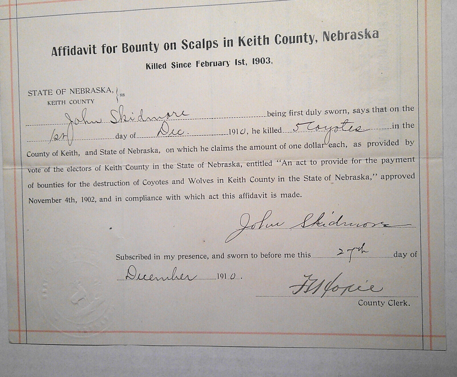 Original 1910 Affidavit for Bounty on Scalps in Keith County, Nebraska. [5 coyotes, at $1 each].