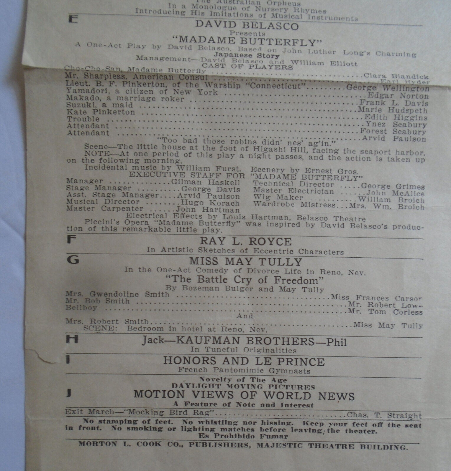 1913 Madame Butterfly - David Belasco Orpheum Theater Los Angeles Clara Blandick