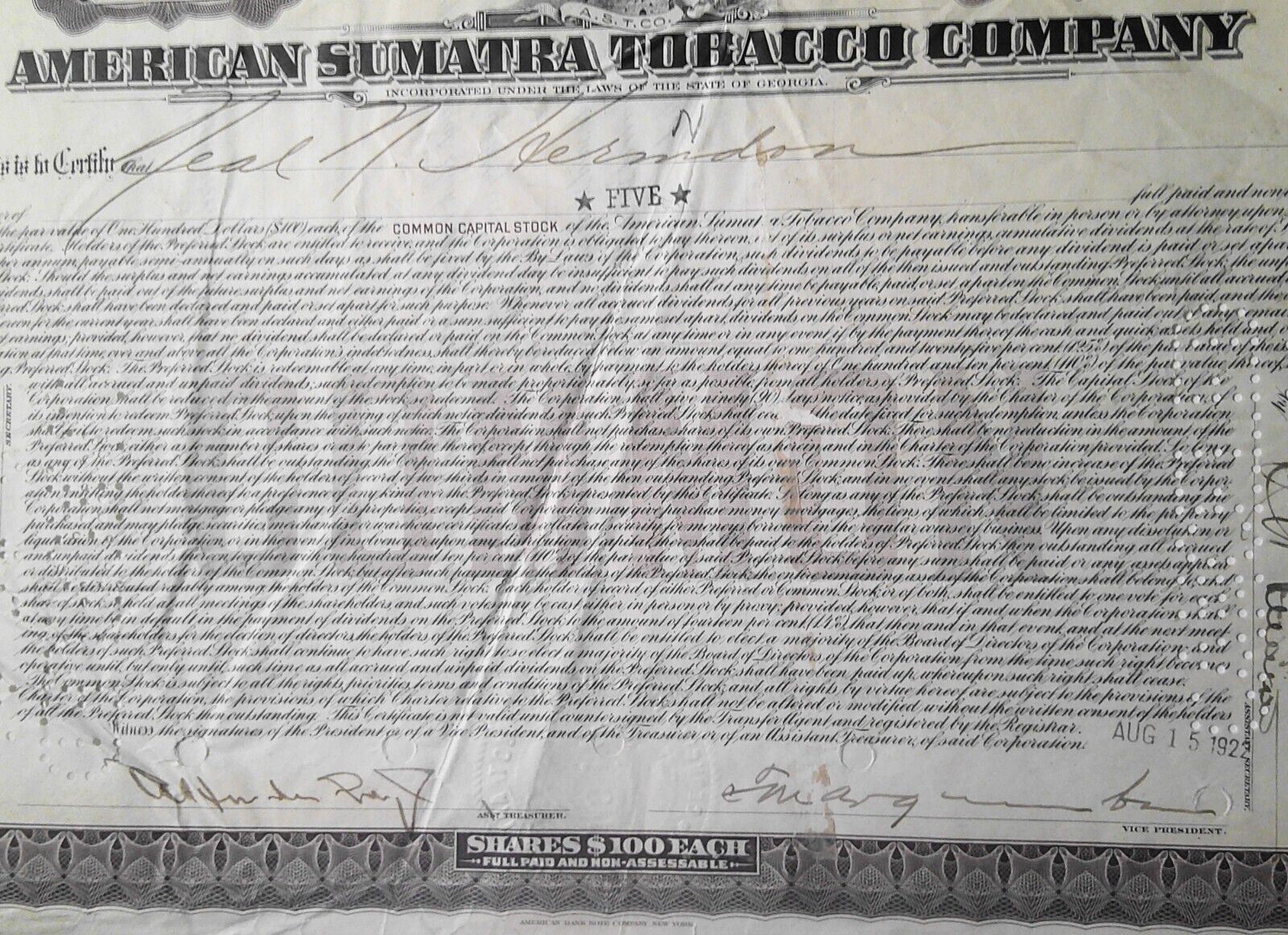 1922 American Sumaytra Tobacco Company Stock Certificate - Five shares