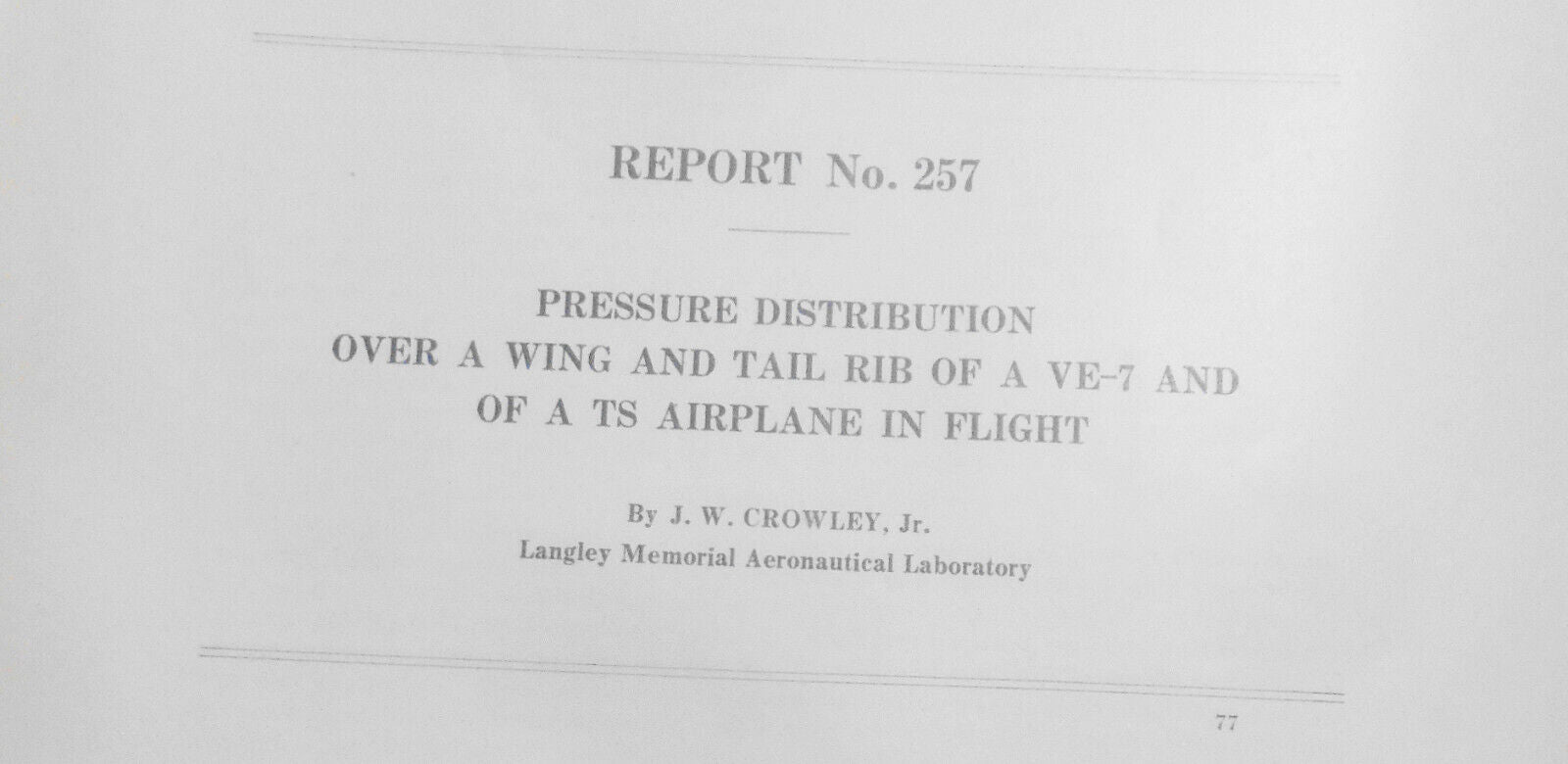 Pressure distribution over a wing and tail rib of a VE-7 and of a TS airplane in flight - by J. W. Crowley.