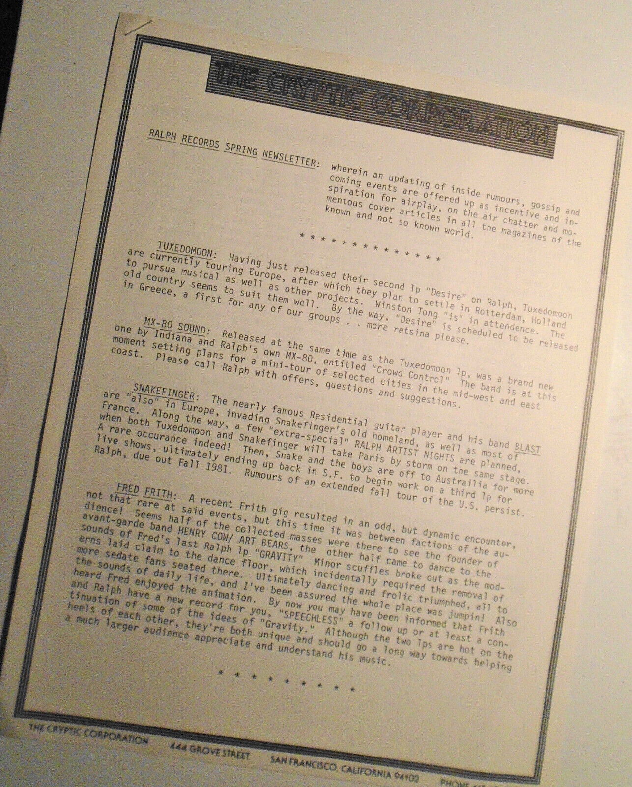 Original 1981 Ralph Records Spring Newsletter : Residents, Tuxedomoon, Snakefinger, MX-80 Sound, Fred Frith, etc.