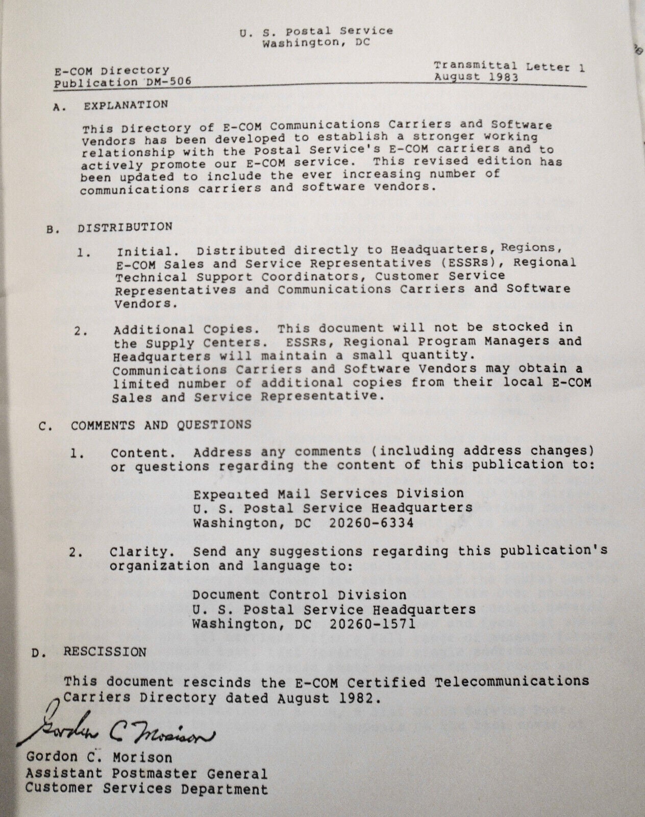 E-COM, Electronic Computer Originated Mail, began on January 4, 1982, and ended on September 3,