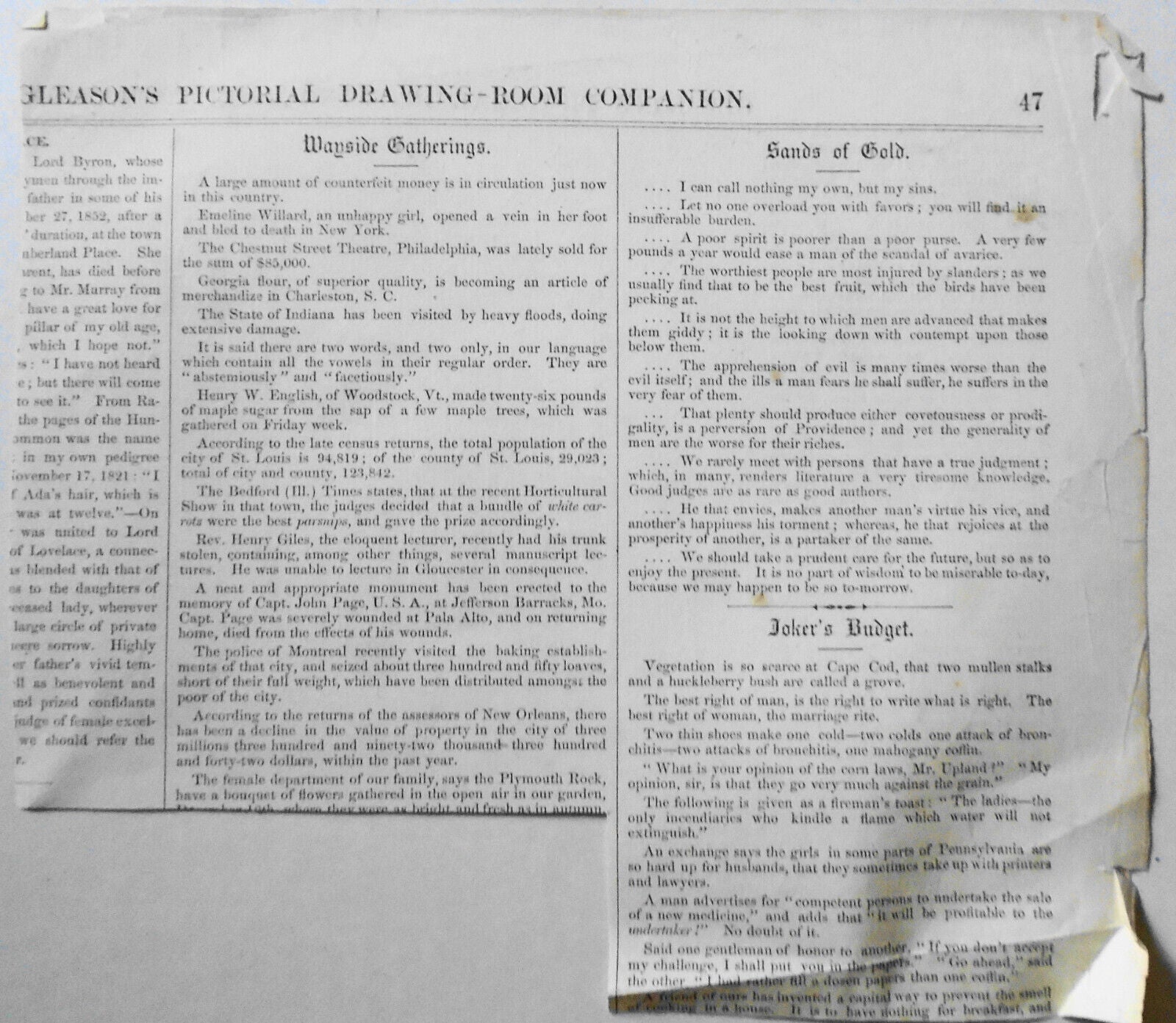 GLEASON'S PICTORIAL DRAWING-ROOM COMPANION - ORIGINAL, STORY & PRINT - FREE ACADEMY, NEW YORK - 1853
