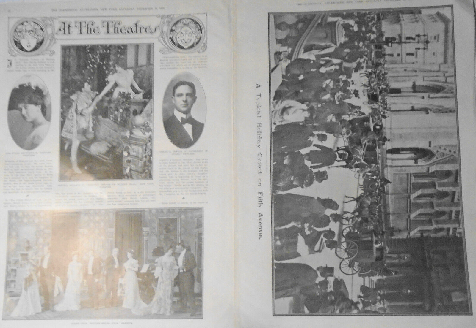 The Commercial Advertiser, New York, December 19, 1903 : "Where New York Does Its Holiday Shopping" - double page collage of six photographs from the holiday shopping scene in New York. On verso is full page print "A Typical holiday crowd on Fifth Avenue", and "At the Theatre" page with four photographs.