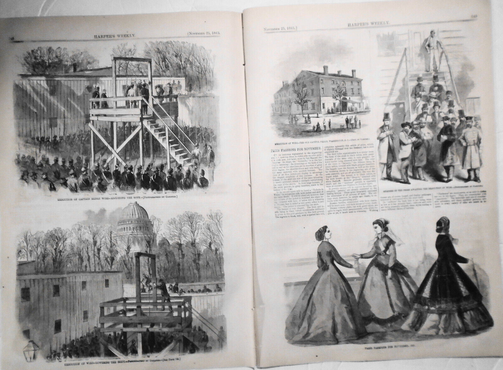 ORIGINAL Four pages section with 4 prints and story about the execution of Captain Henry Wirz, commander of the infamous Confederate prison at Andersonville, Georgia,