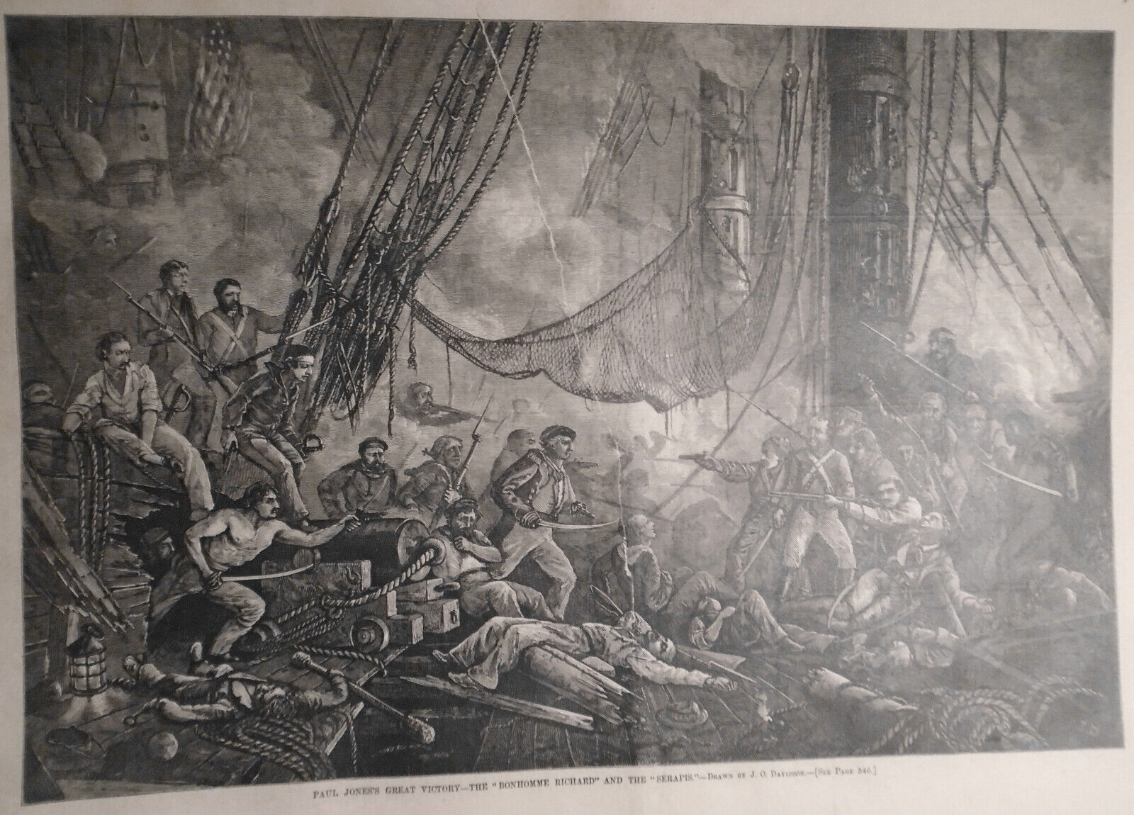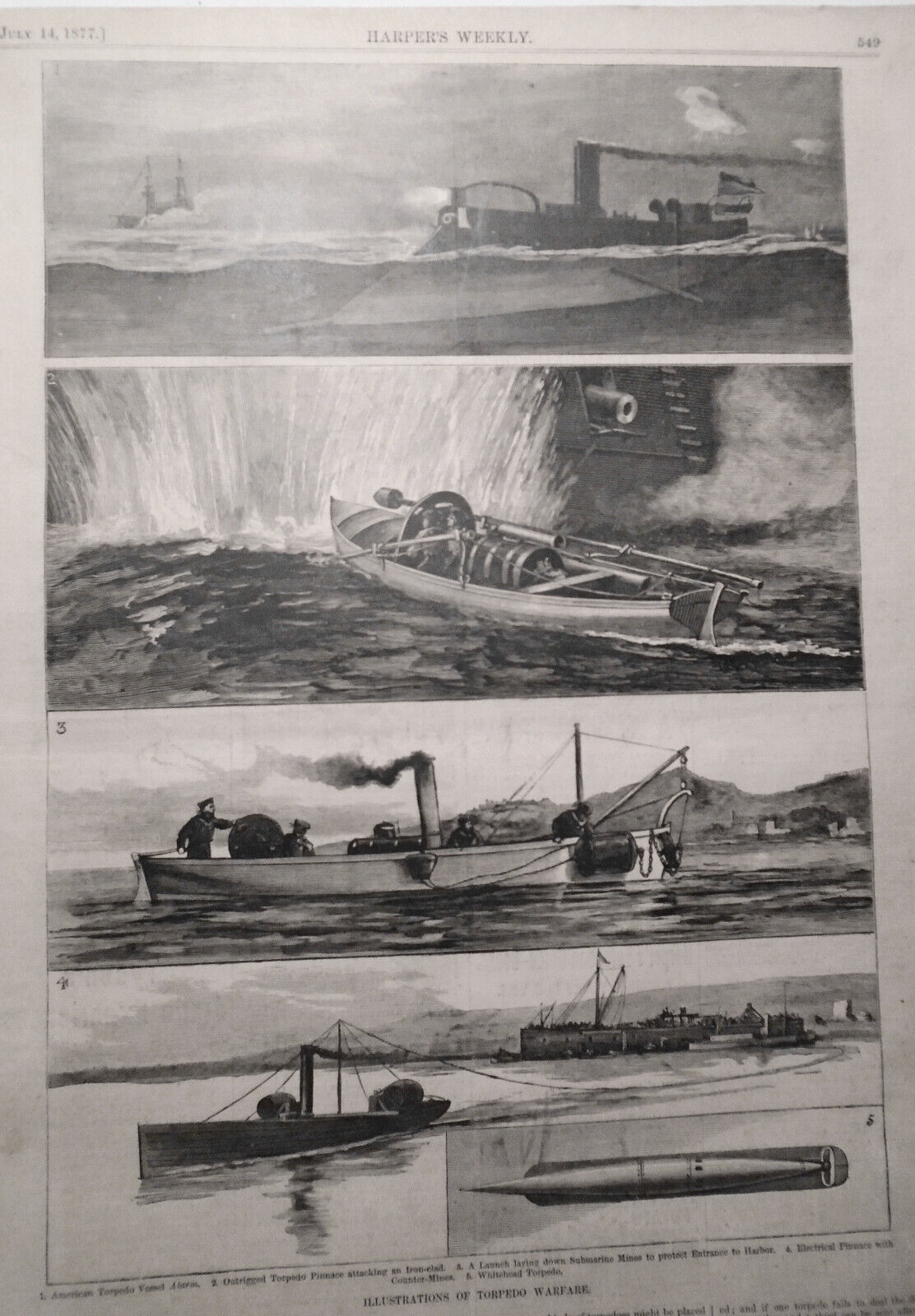 Front Cover: "British Interests" By Thomas Nast. - Shows Cartoon Of Woman Holding A Handkerchief To The Nose Of A Crying Spinx Statue. - Full Page Print: "Scene On A New York Dock--stevedores Unloading Unloading A Ship" (Shows Horse Drawn Carts) - Full Page Print (Shows Black Characters) "The "Fourth" In Blackville--"Hold On To Sumfen, She's Goin' Off Dis Time" - Double Page Center Fold: "The Force Of Early Habits" + Story - Full Page Print: "Paul Jones Great Victory--the "Bonhomme Richard" And The "Serapis" (Has Large Closed Tear Through It) + Story. - "Torpedo Warfare" Story & Prints, Prints Of Various Sizes: From Approx: 1 1/2 In. X 4 1/2 In. To Approx: 3 1/2 In. X 8 1/2 In. Show: 1. American Torpedo Vessel Alarm - 2. Outraged Torpedo Pinnace Attacking An Iron-clad. - 3. A Launch Laying Down Submarine Mines To Protect Entrance To Harbor. - 4. Electrical Pinnace With Counter-mines. - 5. Whitehead Torpedo. - Full Apge Print: "The Russo-bulgarian Legion--consecration Of Banners In The Presence Of The Grand Duke Nicholas And His Suite" + Story. - "M. Leon Gambetta" Story & Print, Print Approx: 12 In. X 9 In. Shows: Bearded Profile Portrait Of M. Leon Gambetta. - "Paying The Turkish Troops At Rustchuk" Print Approx: 6 In. X 8 1/2 In. + "Feeding Pigeons, Constantinople" Print Approx: 7 In. X 8 1/2 In. ; Folio. Listed with ExportYourStore.com