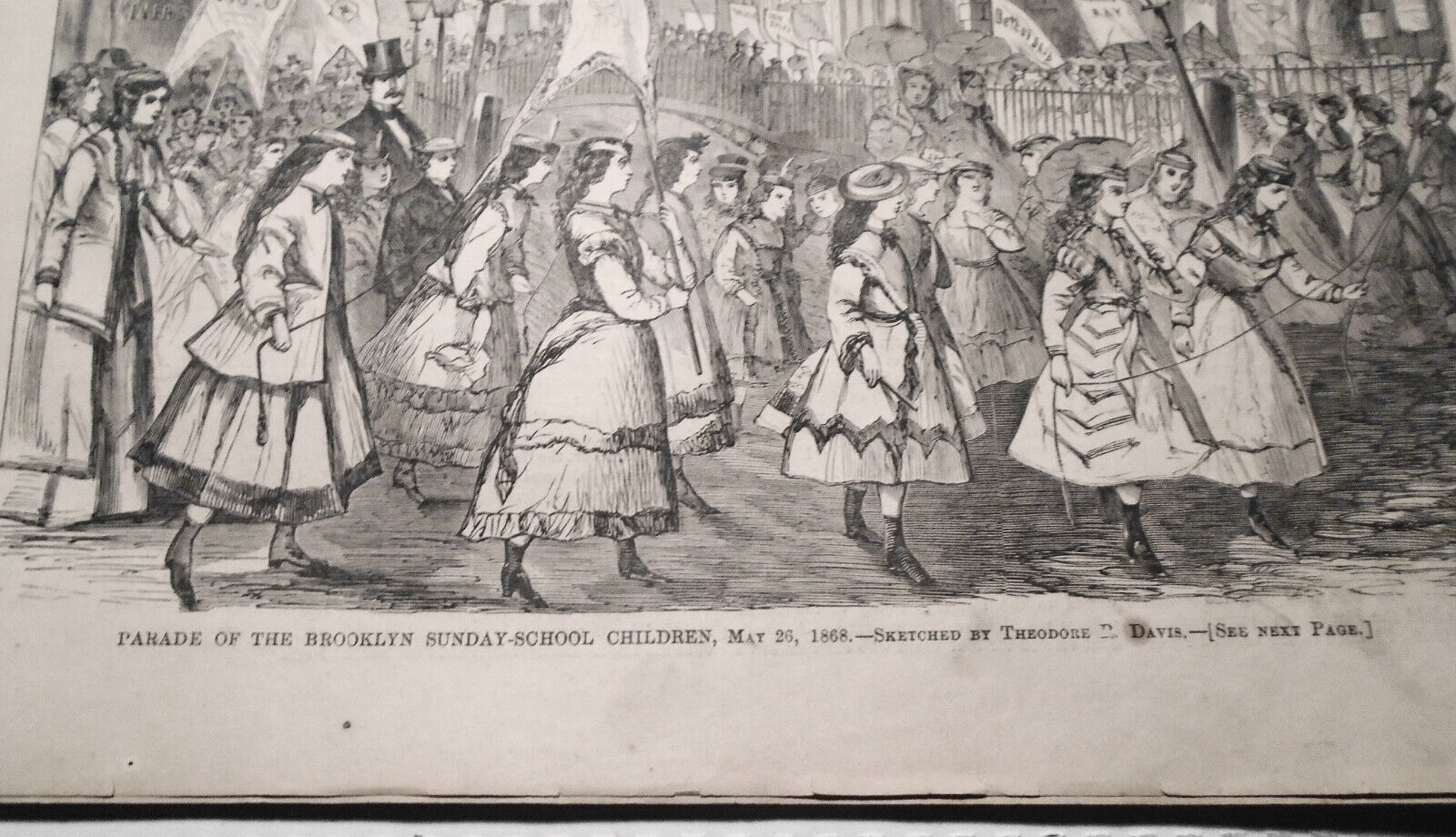 Front Cover Print Approx: 11 In. X 9 In. Show: Children, Mostly All Girls In Dresses, March With Banners..., (Story On Verso) - "General John M. Schofield, The New Secretary Of War" Print Approx 6 In. X 4 1/2 In. Show: Portrait A Bearded John M. Schofield, In Uniform. - General Joseph B. Hawley, Story & Print, Print Approx: 7 In. X 9 In. Show: "General Joseph B. Hawley Formally Tendering The Republican Nominations To General Grant And Mr. Colfax" - Full Page Print & Story, "The Chinese Embassy" Print Approx: 9 In. X 14 In. Show: Interpreters - M. De Champs - Chih-tajin - Minister Burlingame, And Others...in Group Portrait, Some In Oriental Dress, One Holding A Fan, Some Seated, Etc...etc...- New Suspension Bridge, Story & Print, Print Approx: 7 In. X 13 In.show: "Proposed Suspension Bridge Over The Hudson River, Near Anthony's Nose, In The Highlands, As Planned By General Edward W. Serrell, Engineer-in-chief" - Brougham, Story & Print, Print Approx: 8 In. X 7 In. Show: Portrait Of "The Late Lord Henry Brougham" - "Magdala" Story & Print, Print Approx: 4 1/2 In. X 9 In. Show: "View Of Magdala, King Theodore's Strong-hold" - New Jersey Fish Farm, Story & 6 Prits, Prints From Approx: 2 1/2 In. X 3 1/2 In. To Approx: 3 In. X 6 In. Show: 1. "The, Troutdale Spring" - 2. "Fig. 1. One Week Old.--fig. 2, Three Months Old--fig. 3, Six Months Old.--fig. 4, One Year Old" The Trout At Various Ages. - 3. "Securing The Trout Spaw" - 4. "Feeding The Young Trout" - 5. "The Troutdale Hatching-house" - & 6. "The Troutdale Fish-ponds" ; Folio.