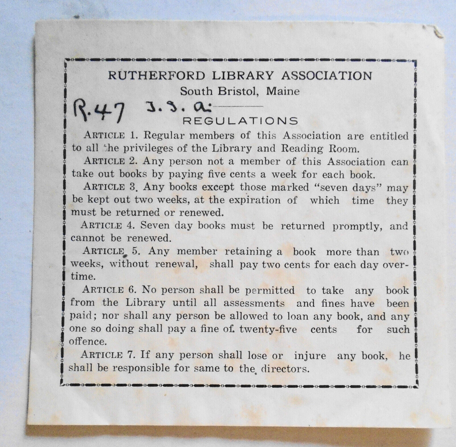 Rutherford Library Association, South Bristol, Maine (Rules & Regulations) Bookplate - 19th century