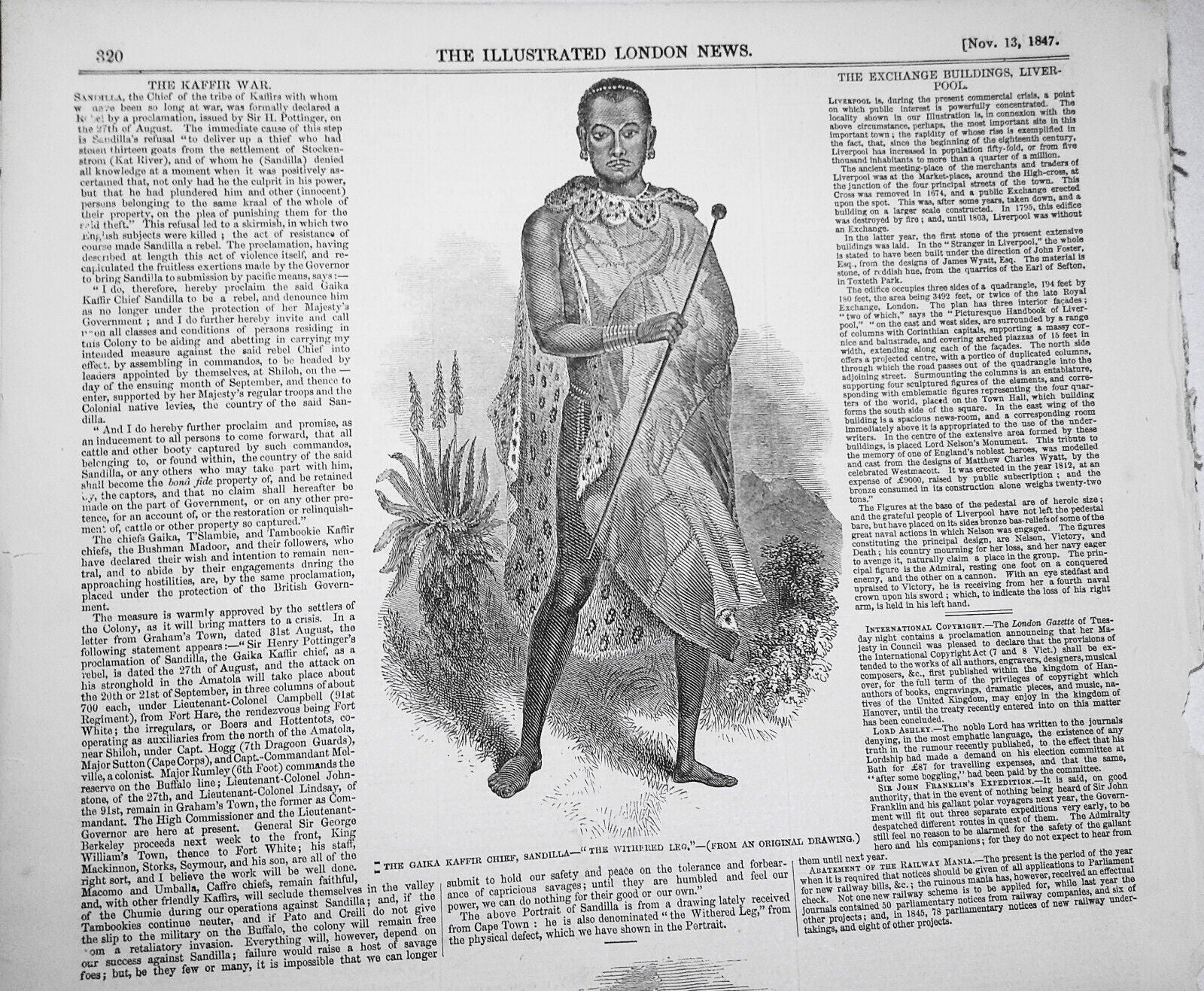 Sandilla, Chief of Kaffirs & Exchange Buildings. Illustrated London News, 1847