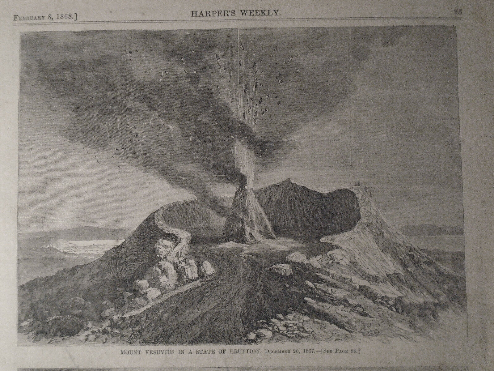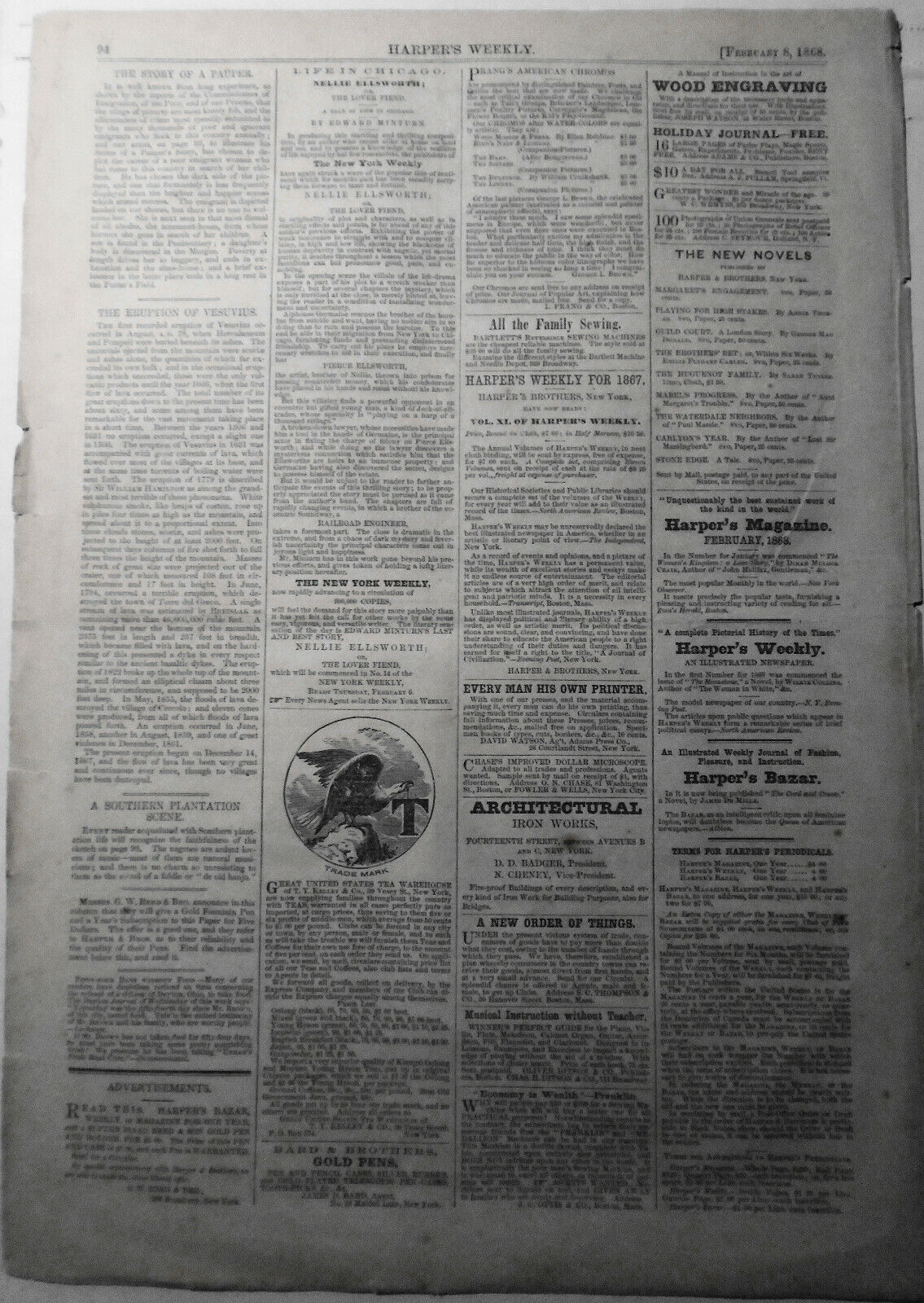 Harper's Weekly - Original, Page With Two Prints - "Mount Vesuvius In A State Of Eruption" / "Scene On A Southern Plantation" & Stories On Verso - February 8, 1868