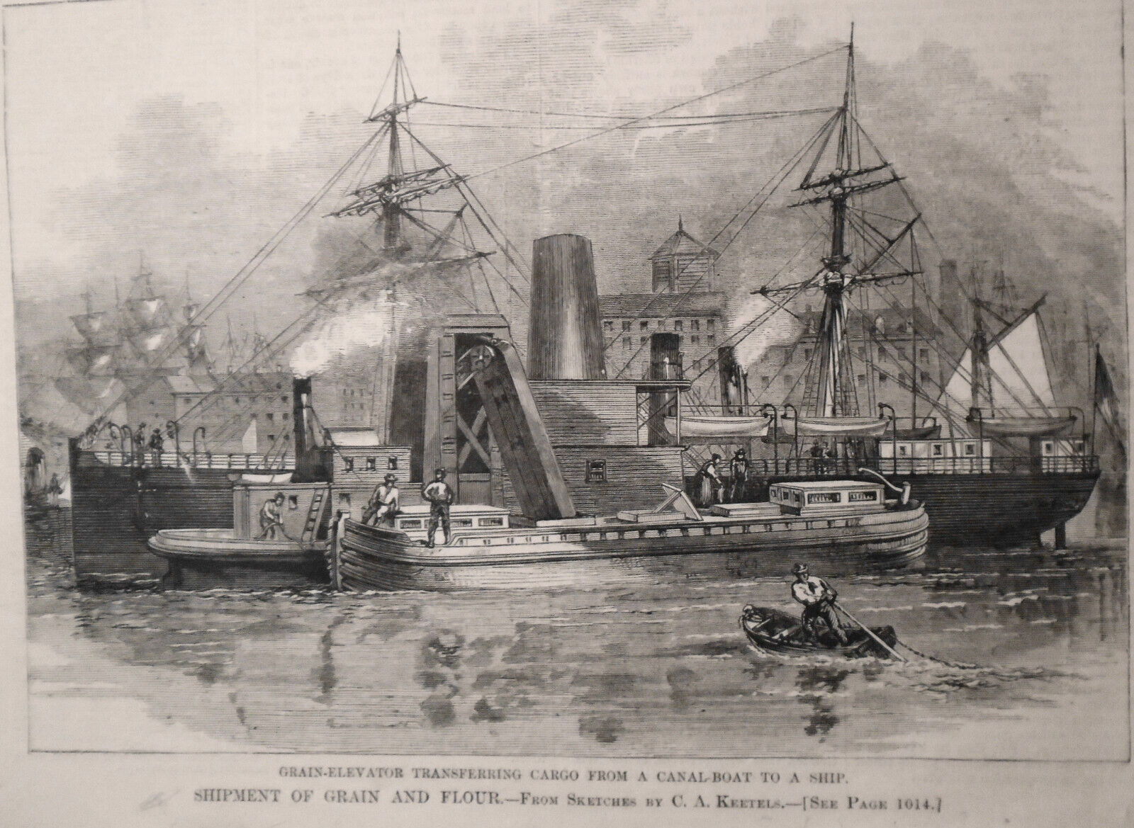 ELEVATOR TRANSFERRING CARGO FROM A CANAL-BOAT, MAN IN SMALL ROW BOAT,