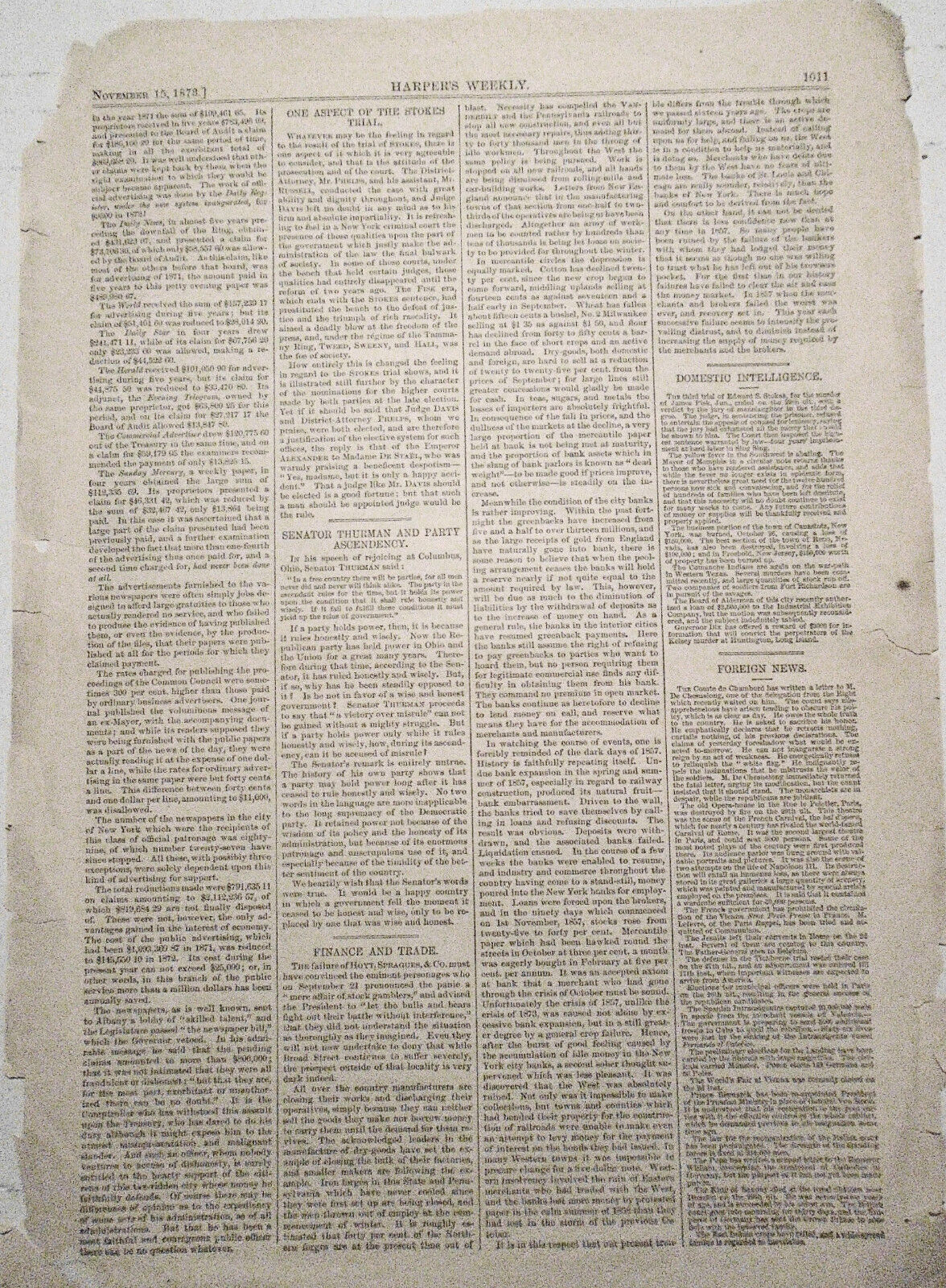 HARPER'S WEEKLY - ORIGINAL FULL PAGE WITH TWO PRINTS - "SHIPMENT OF GRAIN AND FLOUR." (SKETCHES BY C.A. KEETELS) - NOV. 15, 1873