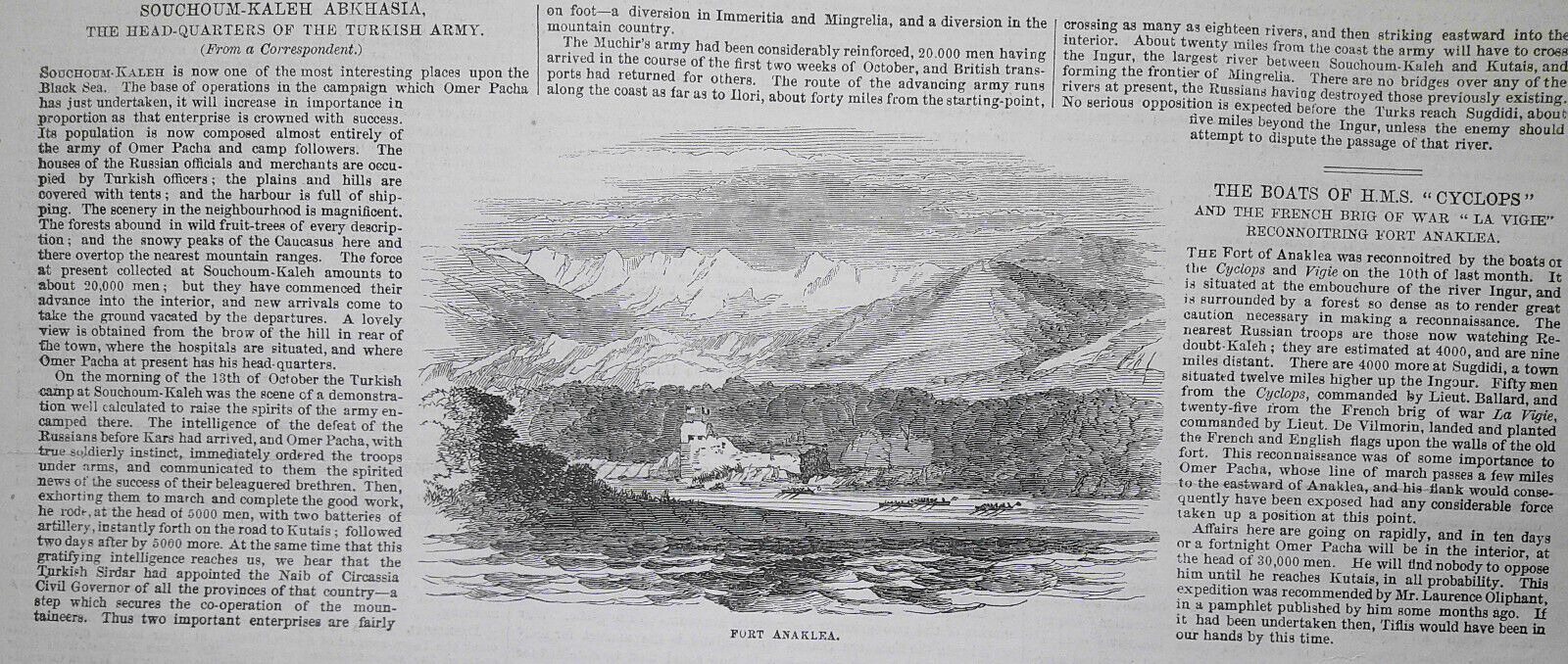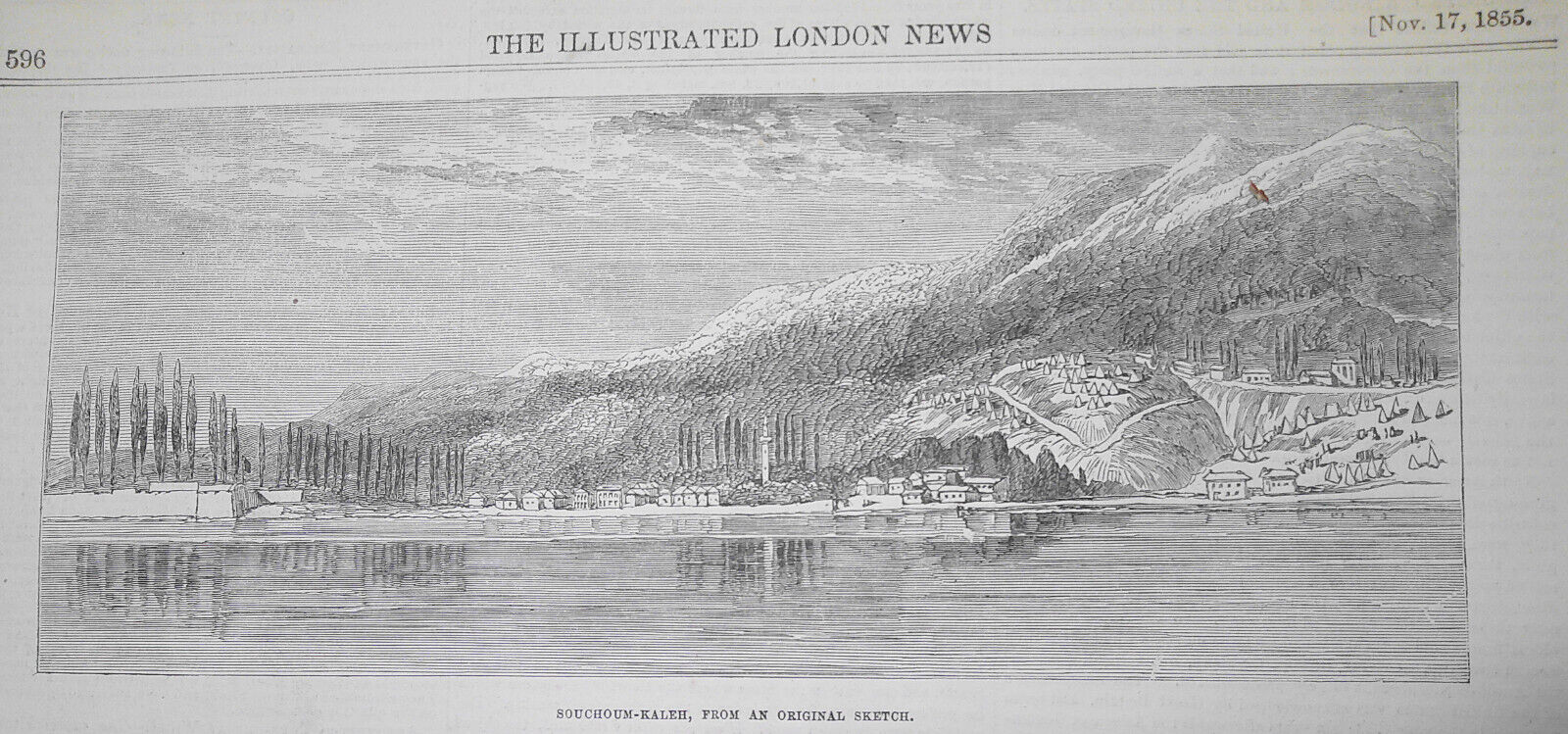 Souchoum-Kaleh, Headquarters of the Turkish Army & Omer Pacha encampment Original page witrh story and 3 prints, from The Illustrated London News, November 17, 855
