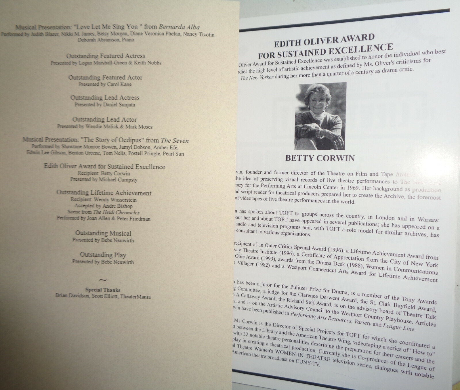 IN B/W, COLOR COVERS. - WITH INSERT - "THE 21ST ANNUAL LUCILLE LORTEL AWARDS" - OFF-BROADWAY'S MOST PRESTIGIOUS AWARD - OPENING NUMBER: "WE'D DO IT ALL AGAIN" WRITTEN BY MICHAEL HEITZMAN, ILENE REID, & DAVID HOLCENBERG, PERFORMED BY MICHAEL HEITZMAN & ILENE REID, DAVID HOLCEMBERG PIANO, ETC...ETC... ; 8vo.