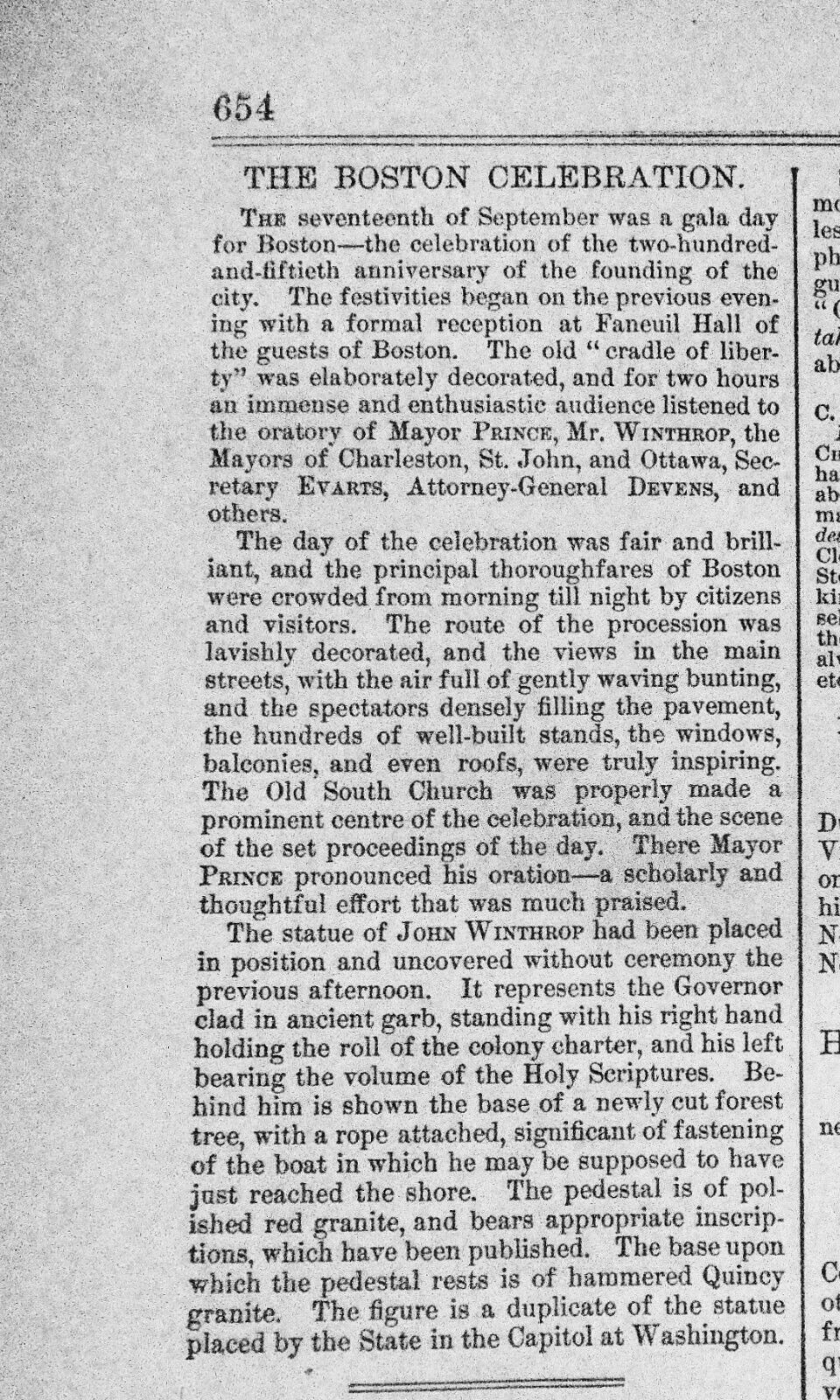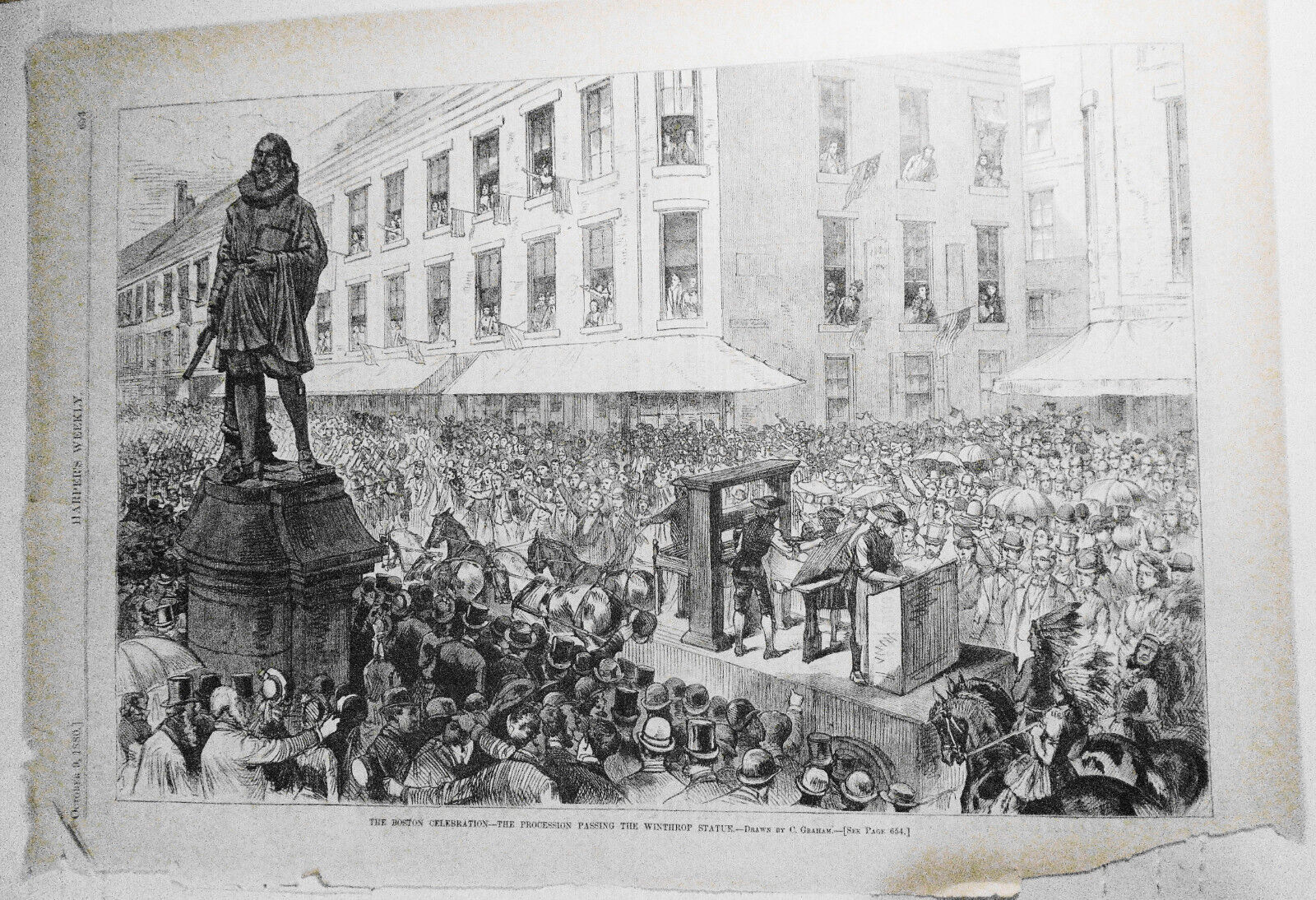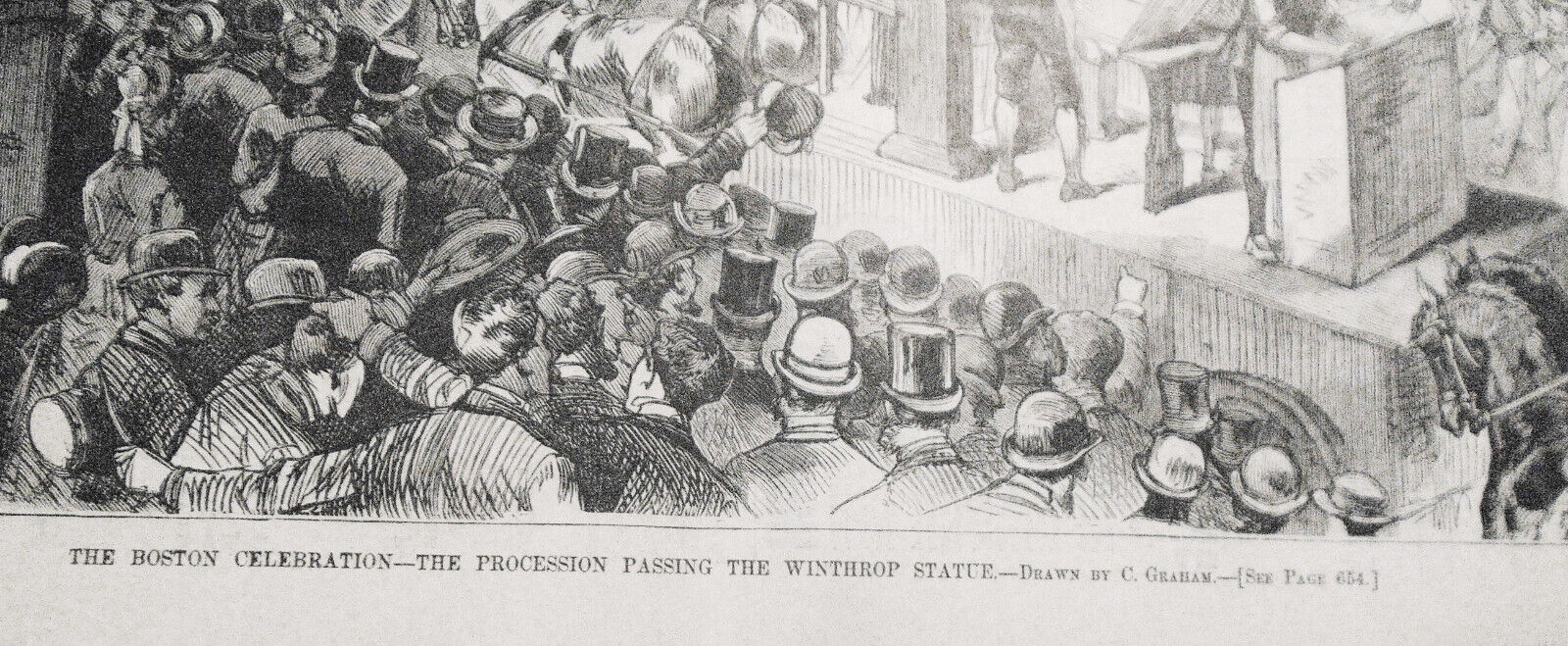The Boston celebration - the procession passing the Winthrop statue. HW, 1880