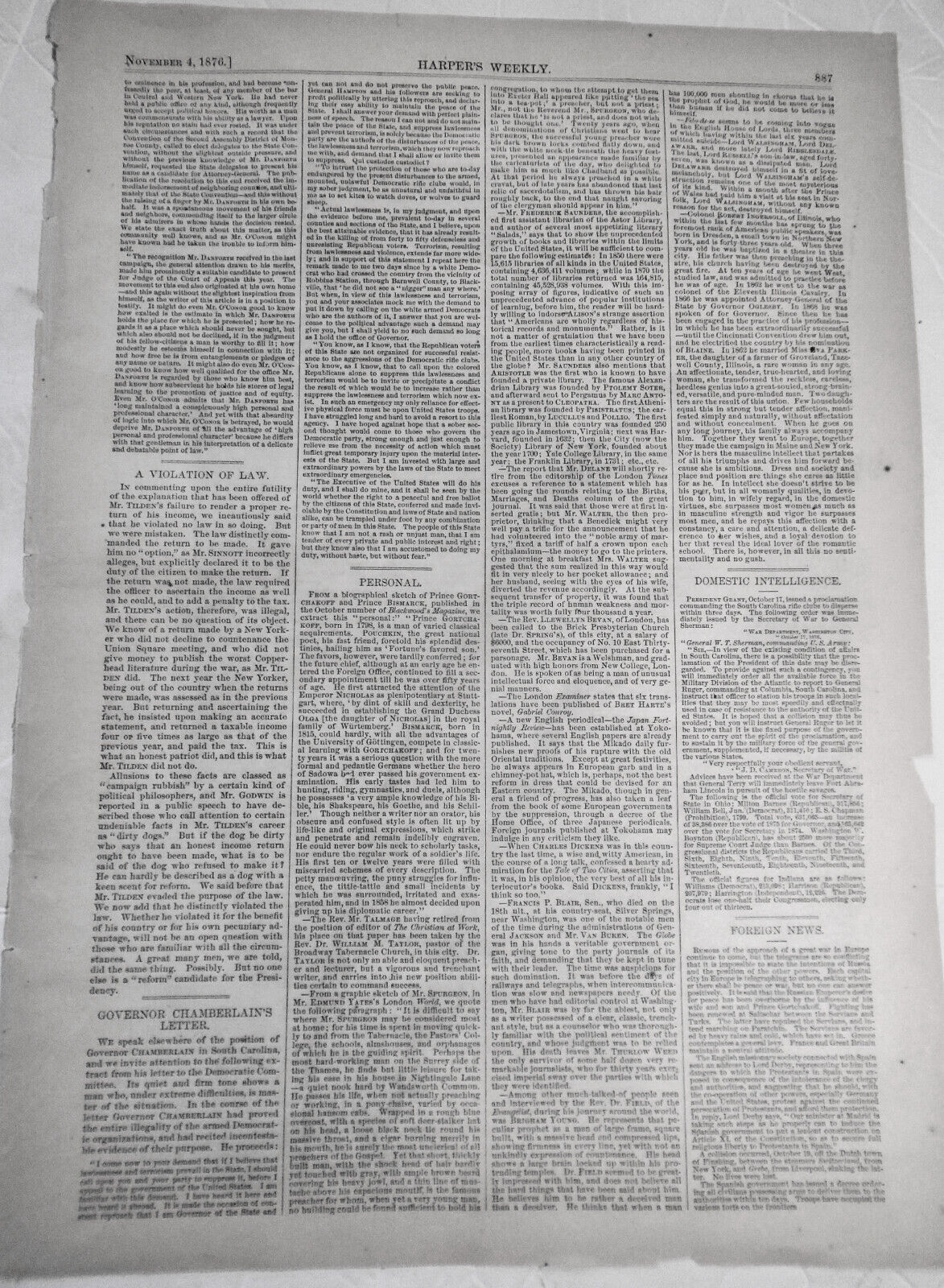 ORIGINAL print on single page from Harper's Weekly, November 4, 1876