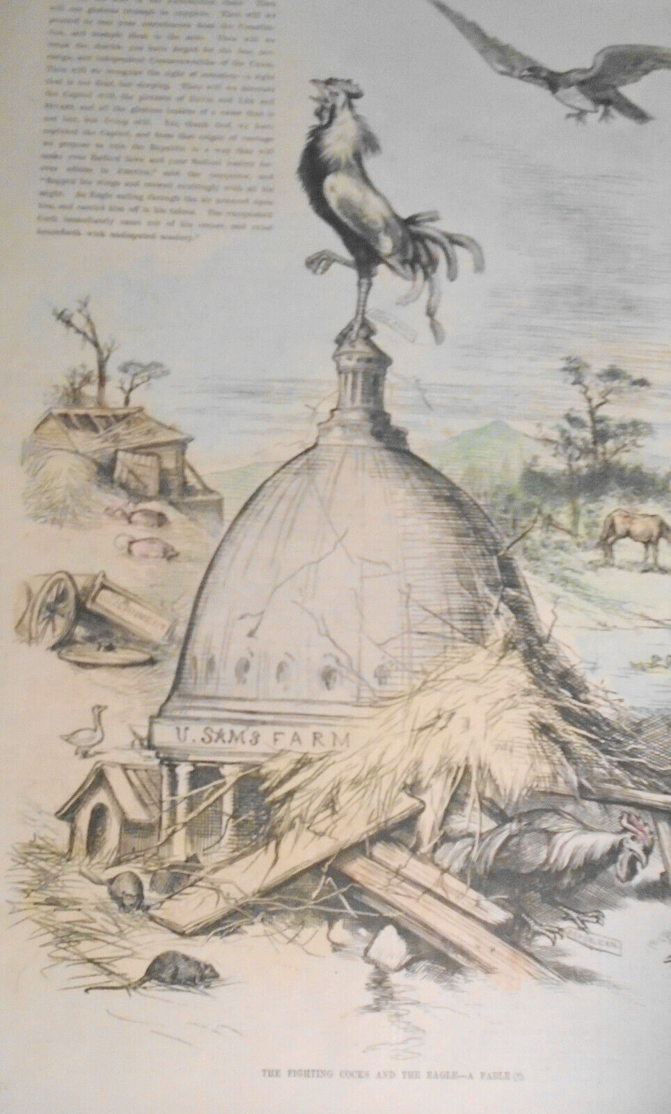 The fighting cocks and the eagle - a fable, by Thomas Nast - Harper's Weekly April 12, 1879. Hand-colored.