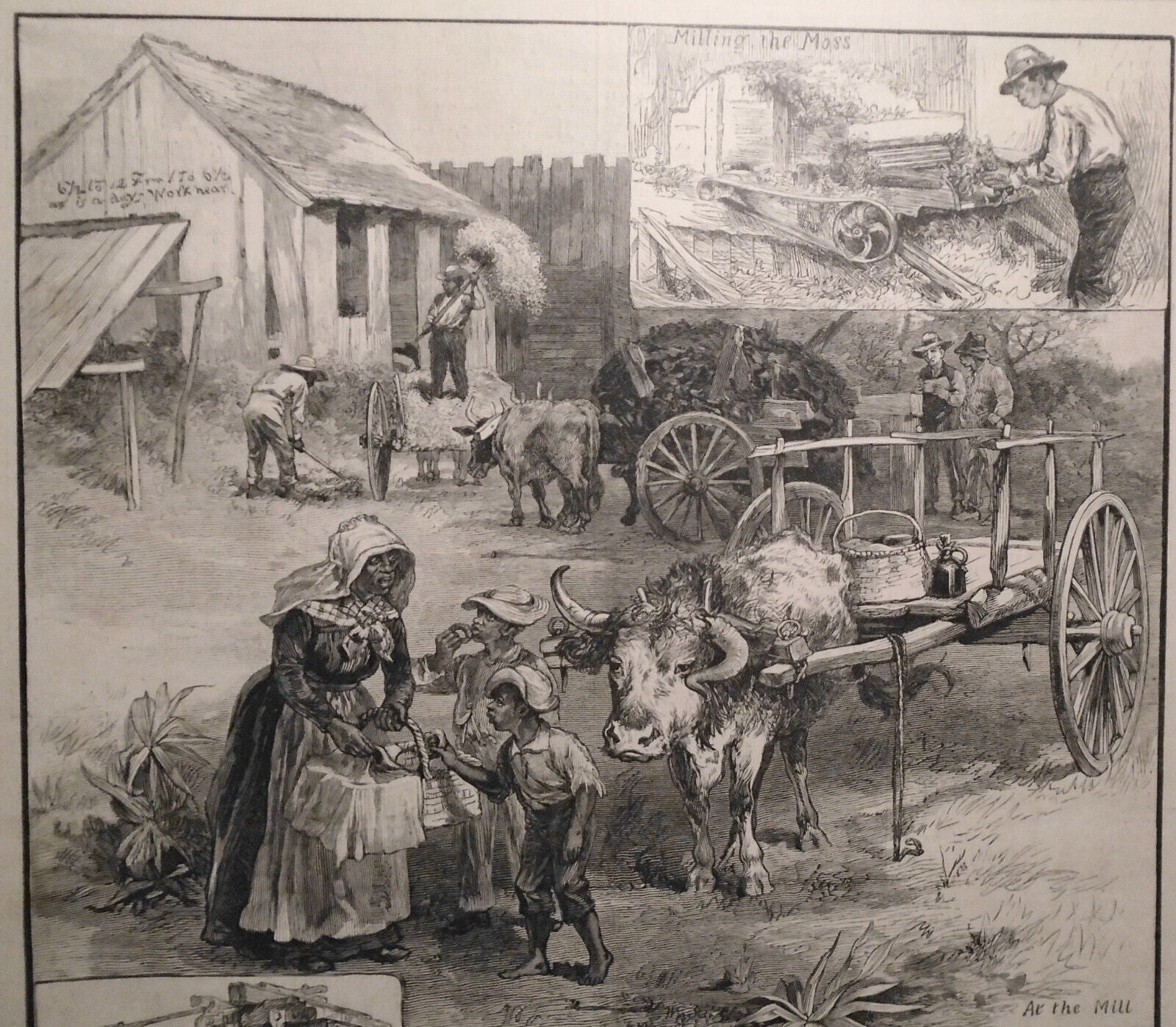 MILLING THE MOSS, AT THE MILL, MOSS PRESS, GATHERING MOSS. Prints;