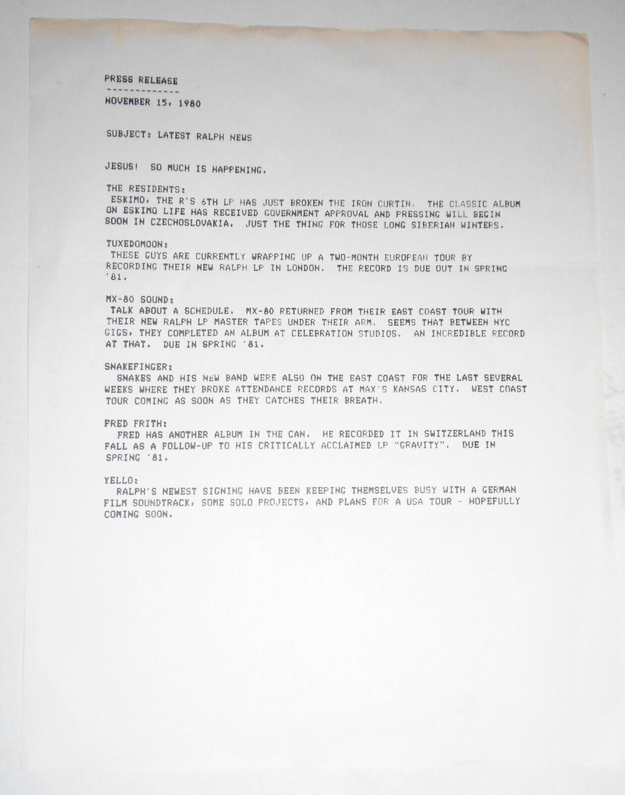Original November 15, 1980 press release of The Residents : Latest Ralph News