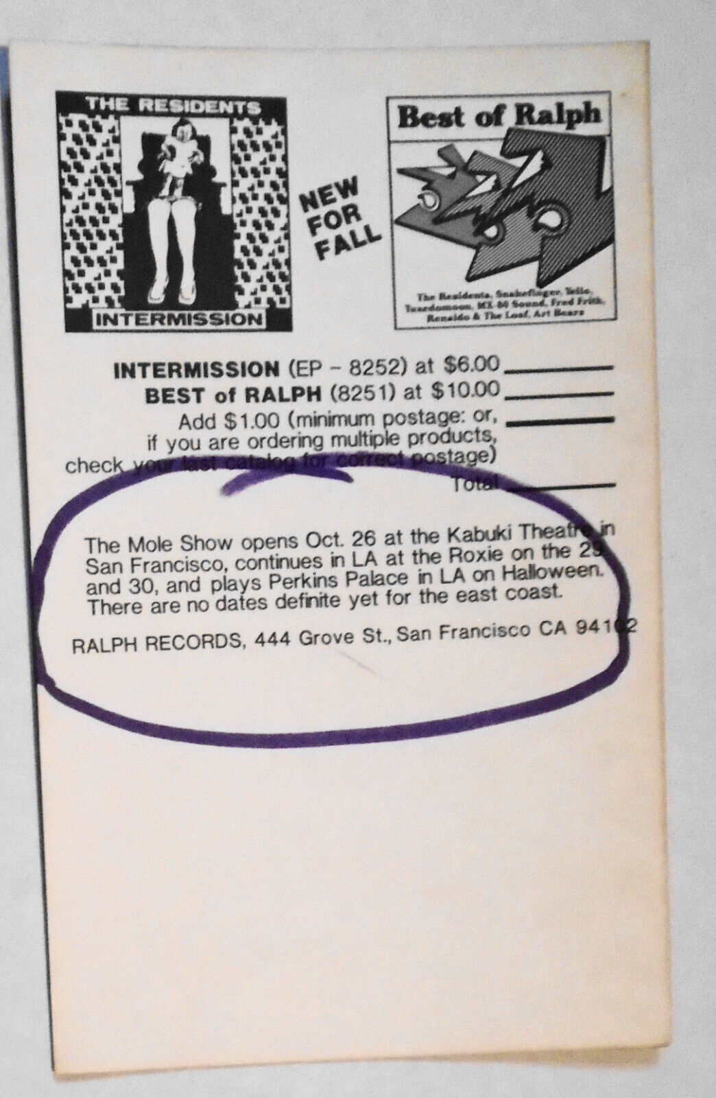 The Residents 1982 Fall Releases Promo Card - Mole Show, Best of Ralph...