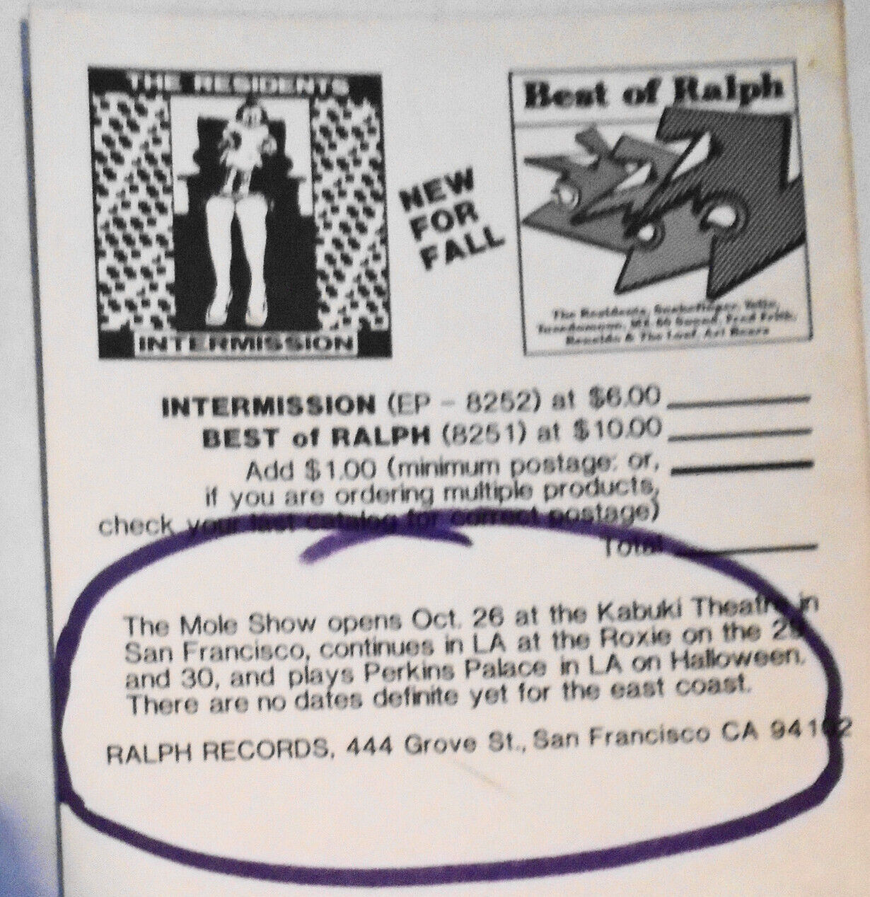 The Residents 1982 Fall Releases Promo Card - Mole Show Announcement, Best of Ralph, Intermission... - 10th Anniversary 1982.