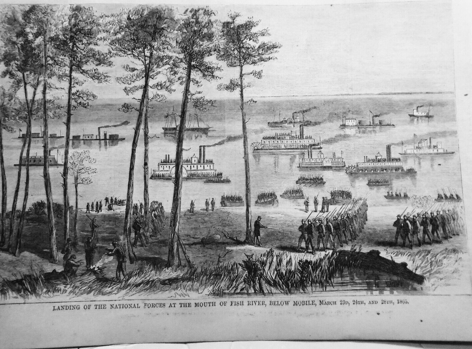 Mouth Of Fish River, Below Mobile ". Full page of prints from an original issue of Harper's Weekly, April 29, 1865.
