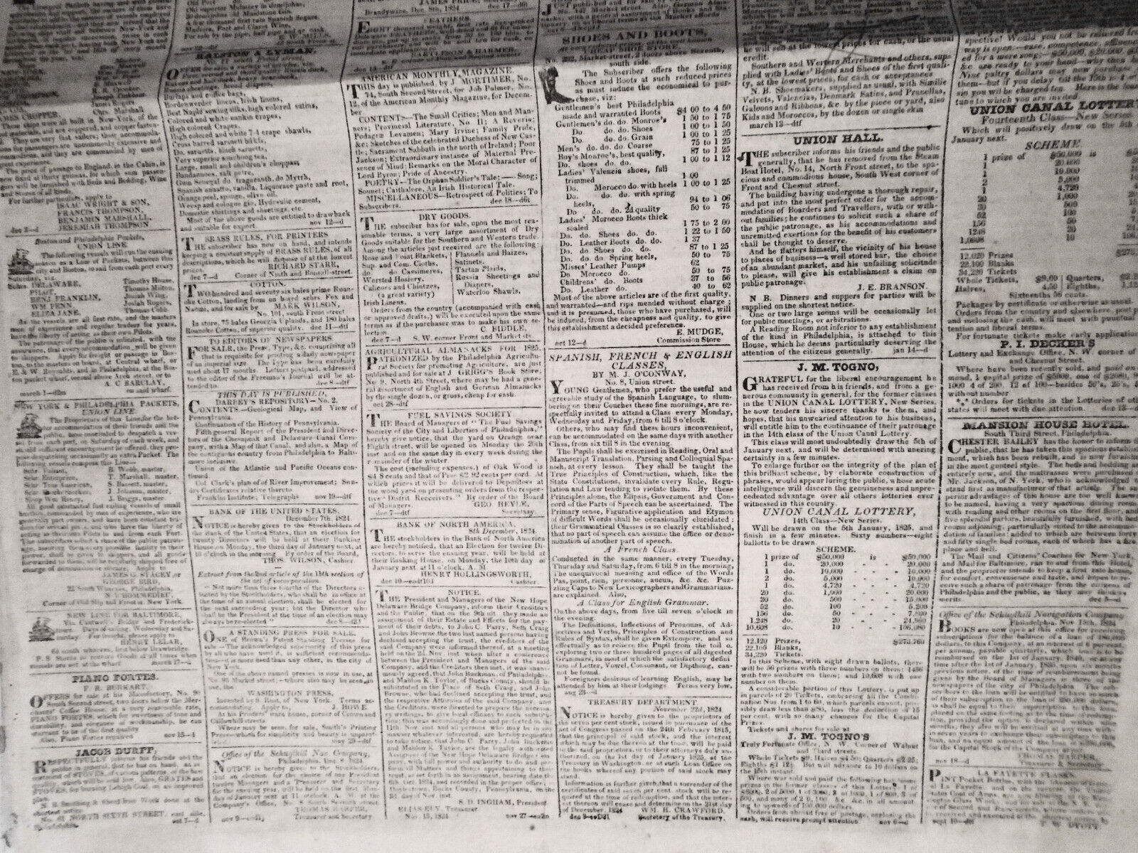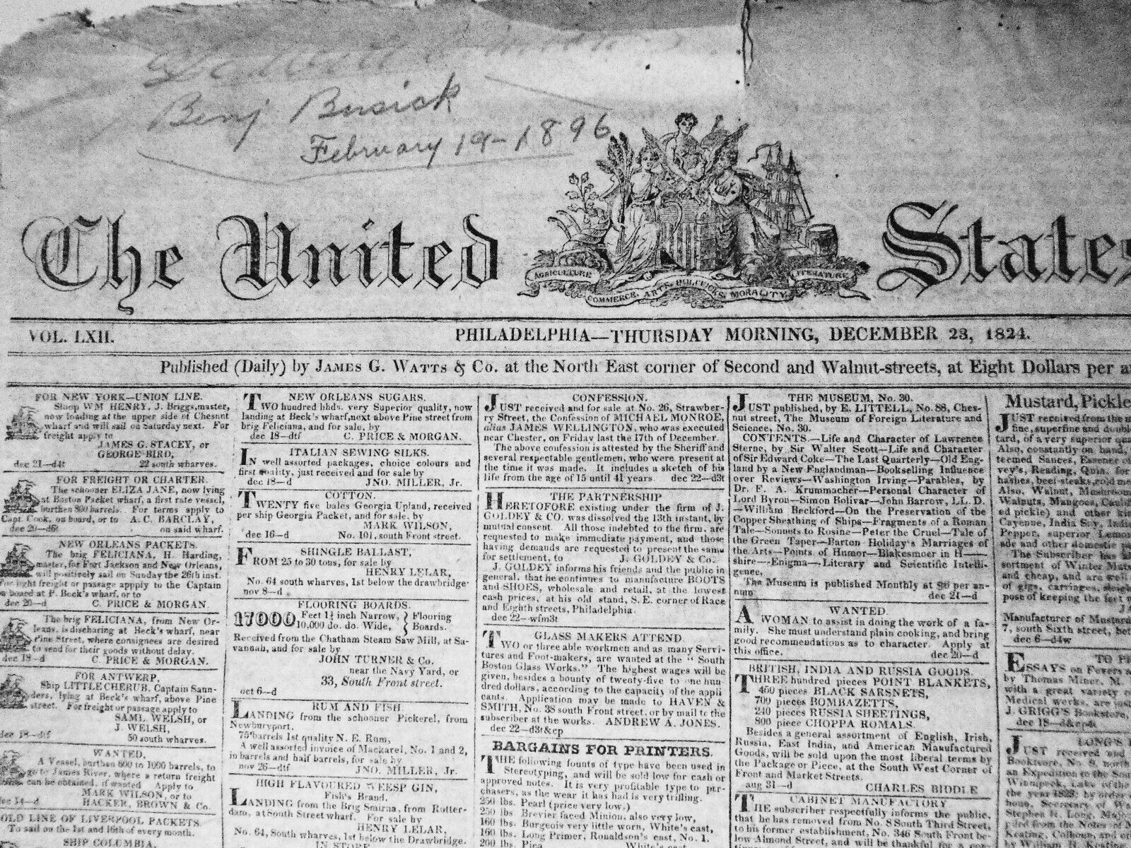 James G. Watts & Co, Philadelphia [Pa.], 1824. Daily newspaper. 4 pages. Elephant folio.