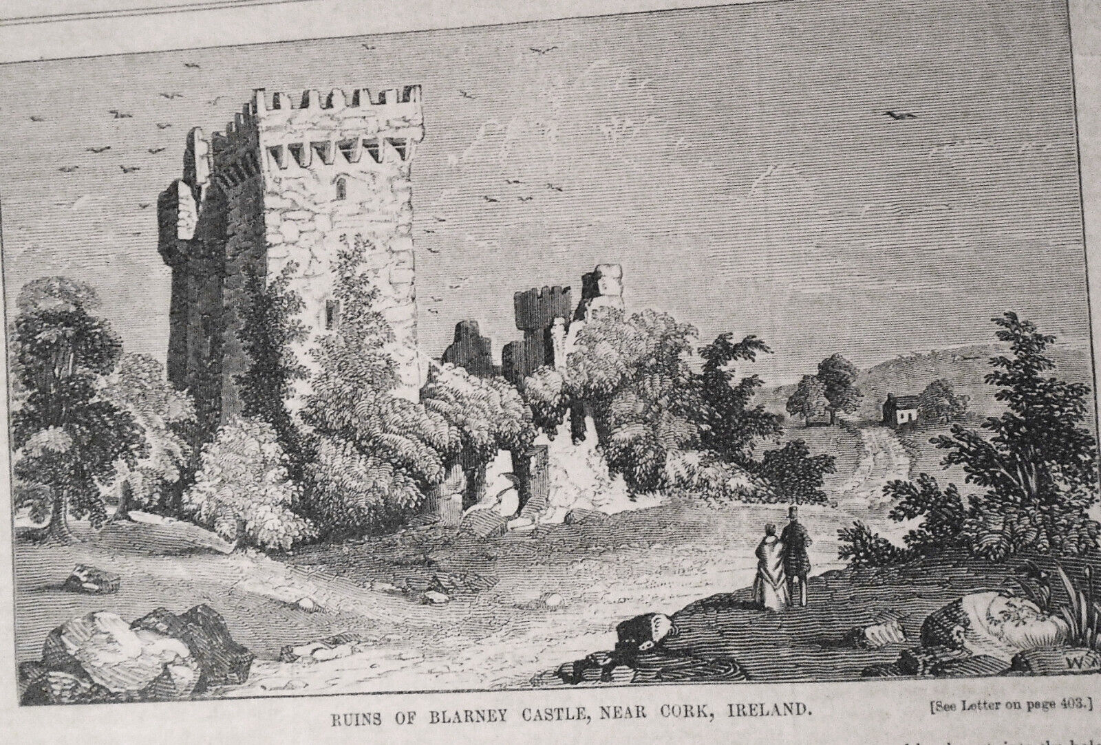 Print Approx: 9 1/2 X 7in. - Shows: Horse Drawn Carriage, Trees, Mountains, Small Houses. ; FolioAlso: Ruins of Blarney Castle, Cork, Ireland.