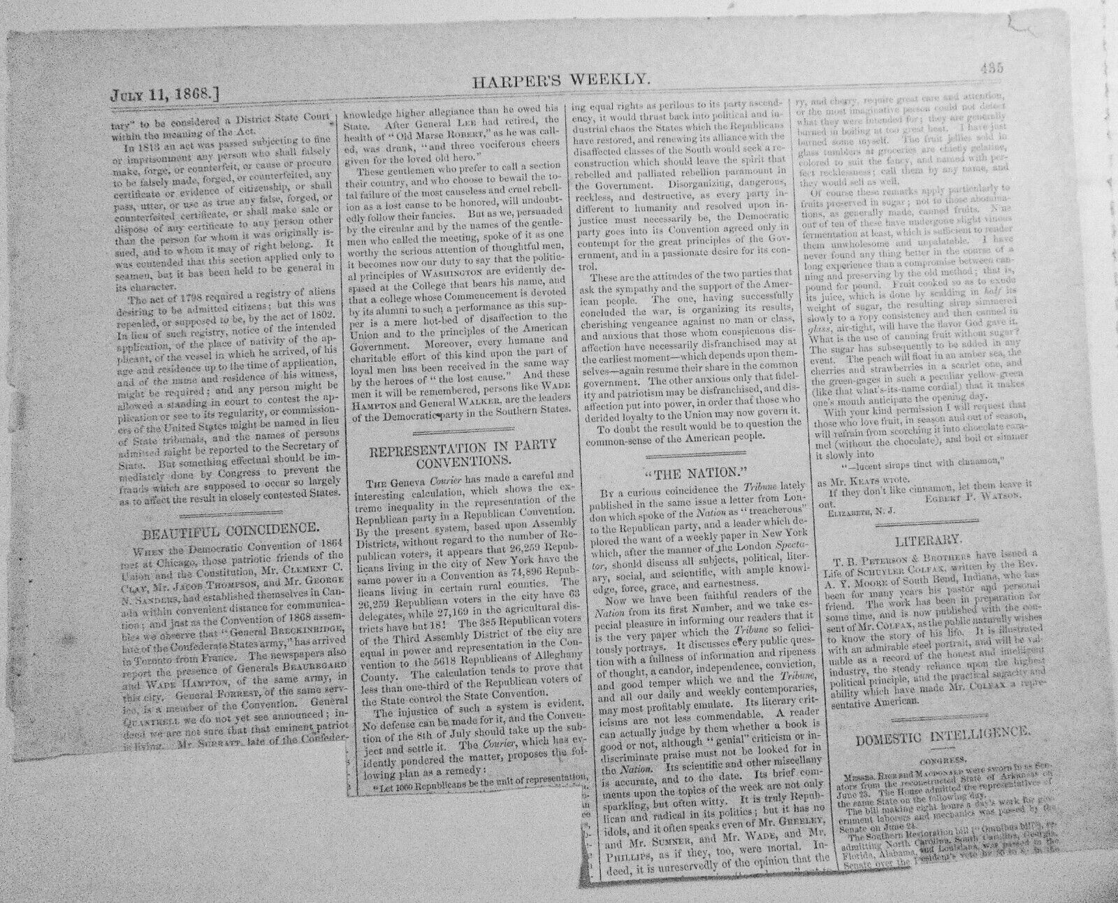 HARPER'S WEEKLY - ORIGINAL, 1/2 PAGE PRINT, WITH STORY - "THE MANHATTAN CLUB" - JULY 11, 1868